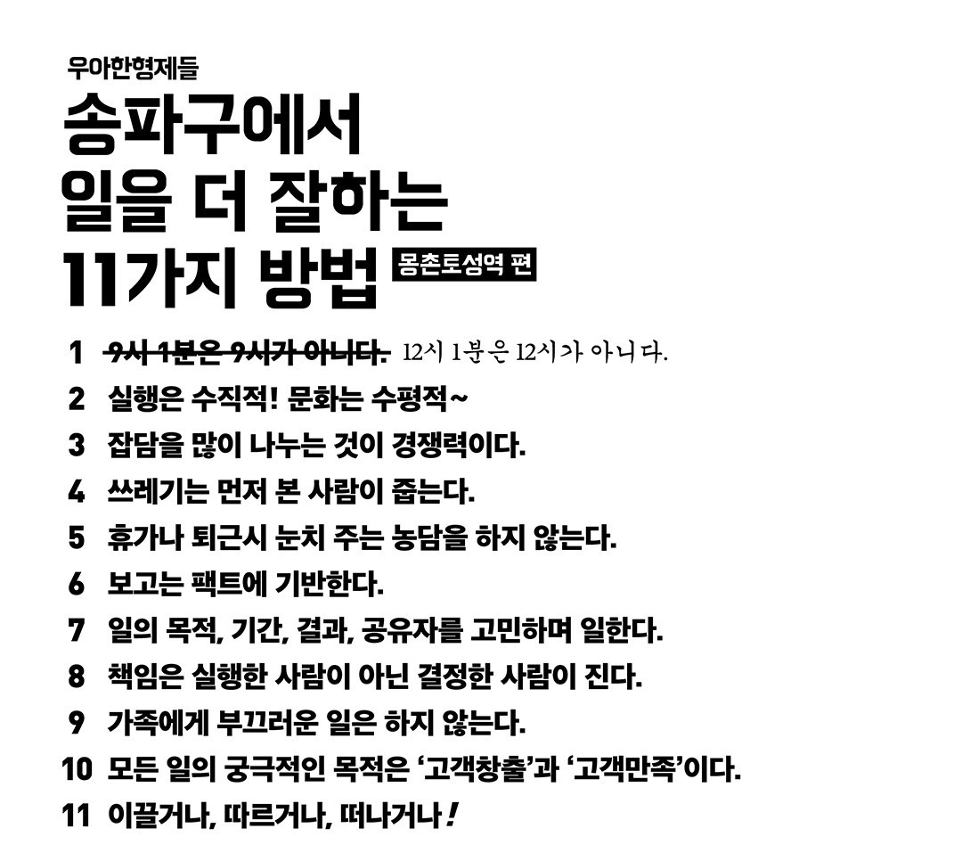 이는 사람과 사람의 성장을 촉진하기 위한 하나의 예일뿐이다. 위와 같은 행동 규칙은 우리 조직의 지속적이며 장기적 관점의 성장을 촉진한다. 오해하면 안 되는 것이 있다. 장기적 관점의 번영(성장)이라고 하여, 단기적인 성공(목표 달성)과 관련이 없다고 생각할 수 있는데 이는 위험할 수 있는 오해이다. 성장은 생존하려는 발버둥에서 싹 트고 시간은 반복된 생존 노력을 성장이라는 열매로 바꿔준다. 이러한 관점에서 위의 '송파구에서 일을 더 잘하는 11가지 방법'을 다시 한번 읽어 보면 다른 것이 보일 것이다.