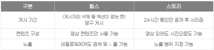 스토리는 기본적으로 게시 후 24시간 동안만 공개 후 사라진다. 더불어 올린 스토리는 팔로워들에게만 혹은 팔로워 중에서도 일부에게만 공개 등 스토리를 노출할 범위를 지정할 수 있다. 반면 릴스는 인스타그램의 여타 게시물과 마찬가지로, 게시자가 삭제하지 않는 한 영구 게시된다. 또한 피드에 게시하면 릴스탭에서 검색도 가능하여 비팔로워에게도 노출이 가능하다. 마케팅적으로 더욱 활용도가 높다 할 수 있다. 다만 스토리는 사진으로 또는 여러 사진을 엮어 제작할 수 있었던 반면, 릴스는 영상으로만 제작이 가능하기 때문에 영상 제작에 익숙하지 않다면 시작이 조금 망설여질 수도 있다.