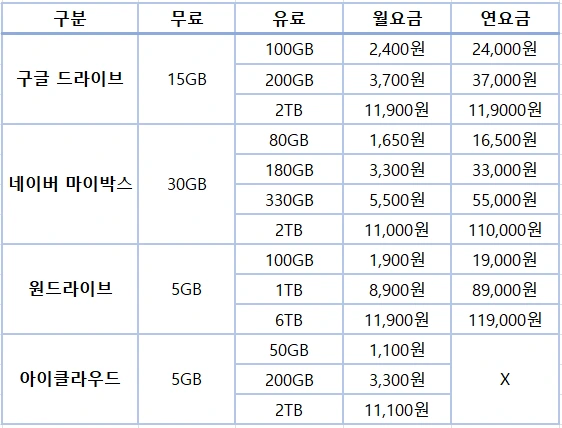 여기까지 클라우드 서비스에 대해 알아보았다. 각종 클라우드 서비스마다 특징, 가격, 용량이 다른데. 어떤 용량이 프로님께 적합할지, 어떤 서비스들이 프로님께 필요할지 비교 분석한 다음 클라우드 사용하길 바란다!
