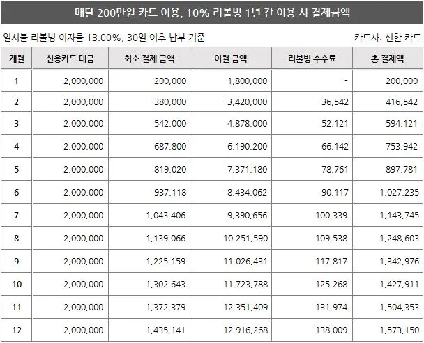 리볼빙 서비스를 1년간 이용하며, 지속적으로 동일 수준의 카드 소비를 하는 경우에는 표의 예시와 같이 월 사용금액은 200만 원이지만 이자를 포함한 총 결제금액만 150만 원이 넘고, 갚아야 되는 원금은 무려 천만 원이 넘게 쌓이는 어마 무시한 결과를 불러오게 되는 것을 알 수 있다.