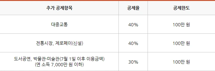 카드 소득공제 총 한도*인 200만 ~ 300만 원 외 추가로 공제 받을 수 있는 항목들이 있다. 바로 대중교통, 전통시장, 도서공연이다. (각 100만 원) 이 항목들을 꽉 채우면 최대 500 ~ 600만 원까지 공제가 가능하다. 올해부터는 제로페이 사용 금액이 전통시장 항목과 통합되어 실 결제금액 250만 원이 넘으면 추가 공제 한도인 100만 원을 다 채울 수 있다. 또한, 2019년 7월 1일부터는 도서공연 항목에 박물관 · 미술관 입장료도 포함된다. 단, 도서공연 항목은 연 소득이 7,000만 원 이하인 경우에만 추가로 공제받을 수 있으니 참고하시길.