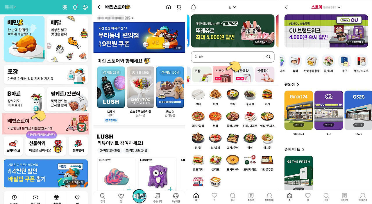 음식 배달 서비스로 잘 알려진 '배달의민족'과 '요기요'는 최근 '스토어' 서비스를 통해 퀵커머스가 가능한 상품 카테고리를 확장하고 있다. 배달의민족은 '배민 스토어', 요기요는 '스토어'에서 식품 외의 상품을 퀵커머스로 판매하고 있는데, CU, 이마트 24 등의 편의점은 물론, 뷰티 제품, 반려동물용품, 꽃이나 식물, 문구, 건강식품 및 스포츠용품 등 다양한 카테고리의 상품들을 구비하고 있다. 이러한 상품들은 브랜드 및 지역에 따라 차이가 있으나 최대 2~3시간 이내에 배송을 받을 수 있다.