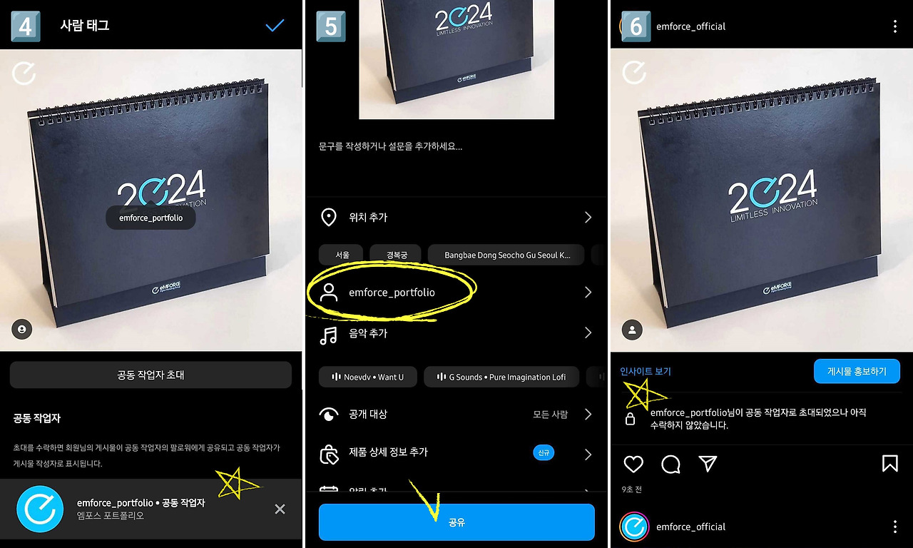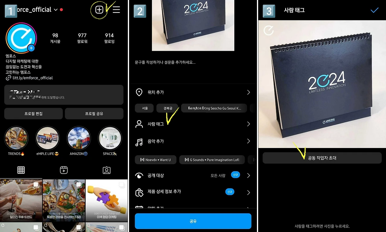 게시물 등록을 위한 [+] → 이미지 등록 및 문구 작성 이후 [사람 태그] → [공동 작업자 초대] → 초대하길 원하는 계정명을 검색하고 선택 → 공동 작업자 표시를 확인하고 게시글 [공유]