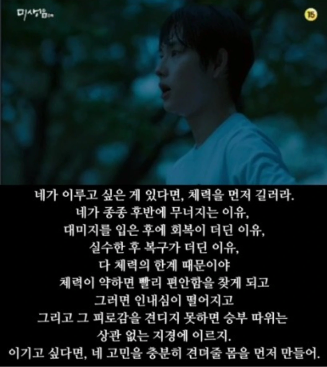 나는 정신력의 기본은 체력에서 나온다는 말을 믿는 사람이다. "미생"에서 나온 체력에 관한 대사를 보고 크게 깨달아 그 말을 삶의 중심축으로 여기며 살아가고있다.
