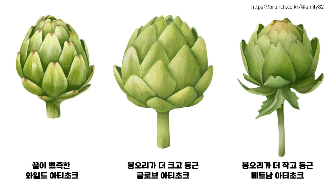 야생 형태 그대로 자연에서 자란 와일드 아티초크와 원산지에 가까운 이탈리아에서 재배한 아티초크는 식용부위인 꽃봉오리가 조금 뾰족하고, 맛이 쓰고 쌉쌀하며, 시나린 함량이 더 높습니다.