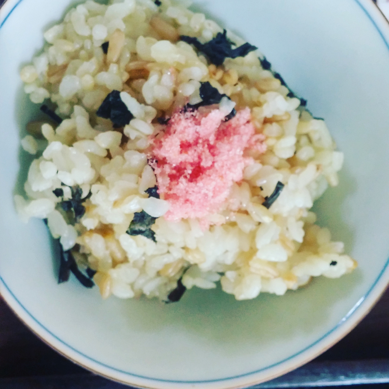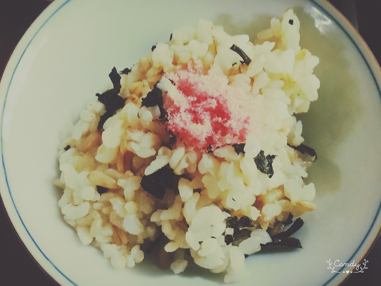 잡곡밥에 핑크빛 소보로를 얹었다