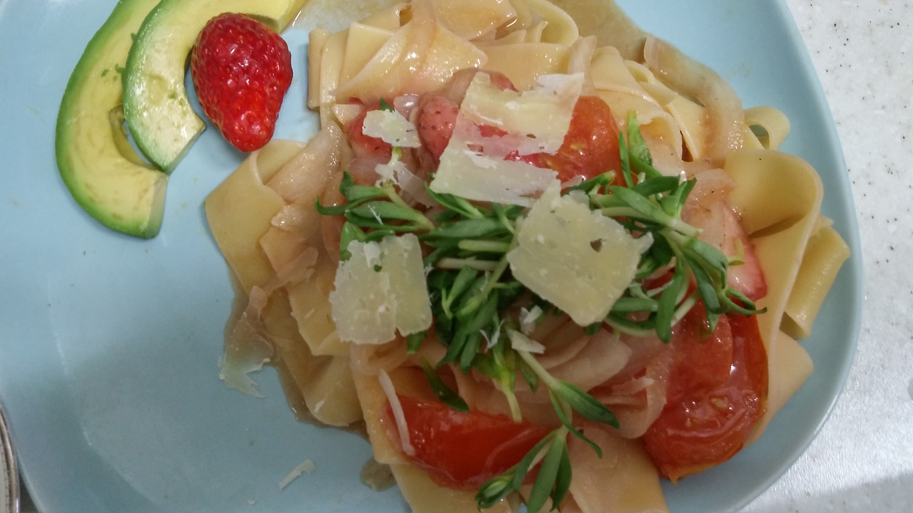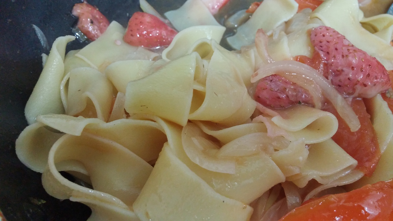 그리고 작년 기장의 멸치로 만들었던 엔쵸비를 덜어다 둔것이 보여서 양파와 엔쵸비.토마토.딸기로 파스타를 만들었다