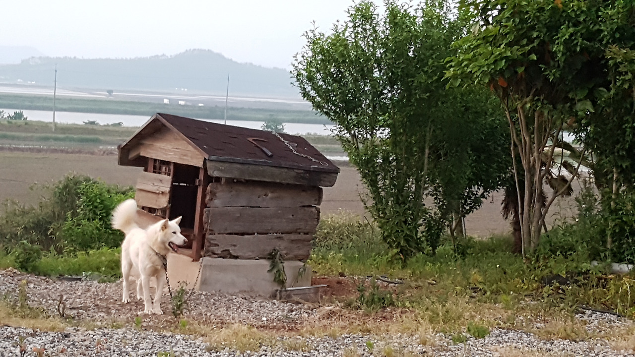 마중나온 백구는 밤새 출장가신 사장님대신 엄마를 지켜주는 든든한 지킴이였다