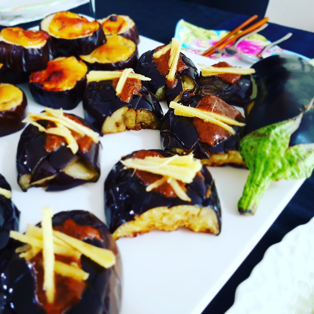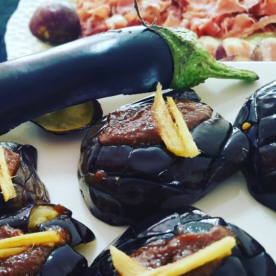 가지를 살짝 튀겨내서 적미소를 바르고 생강채를 얹는다