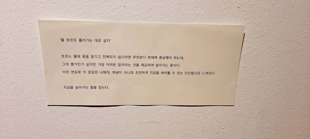 "작품을 매개로 현재의 시간을 쌓은 나와 그 시간의 중첩을 바라보는 관객 모두, 전시를 통해 온전한 자기 만의 지금으로 돌아오는 시작되었으면 한다."