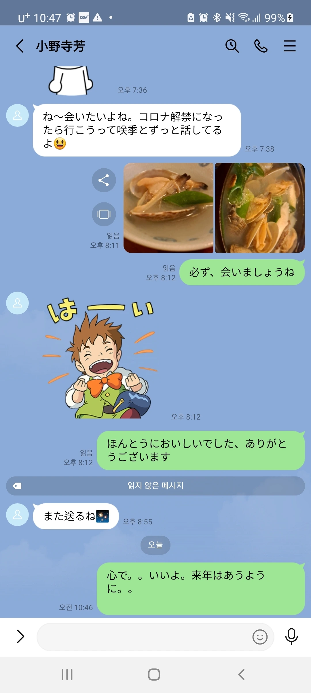 라인에서 이야기도 나누고 전화수다도 떨고 잇는 소중한 그녀의 엄마 내 친구 오노데라상과..어제의 대화도 올려봅니다.모녀와 같이 만날 날을 기대해보던.