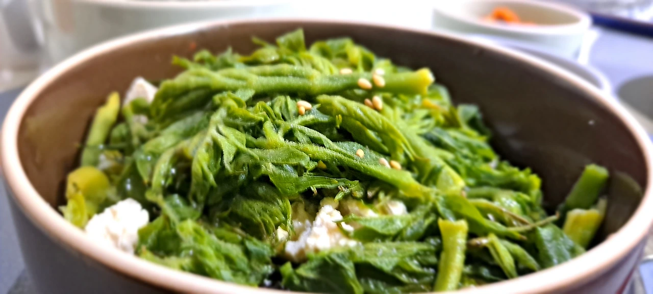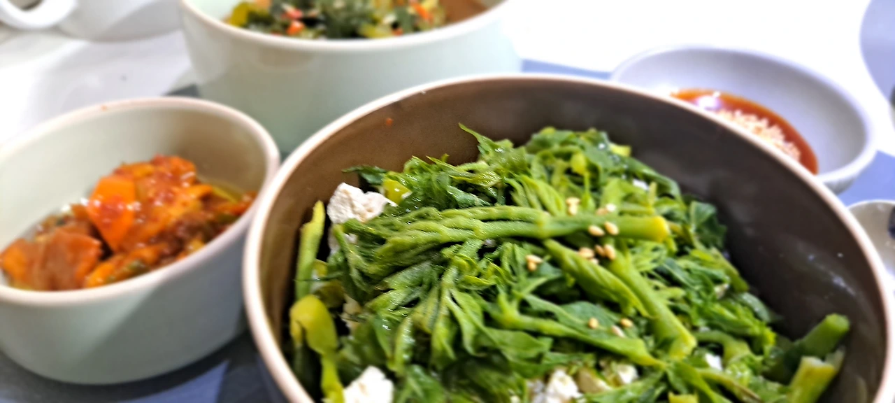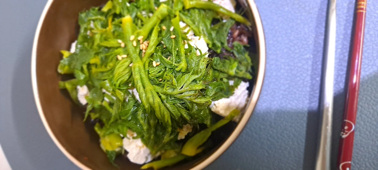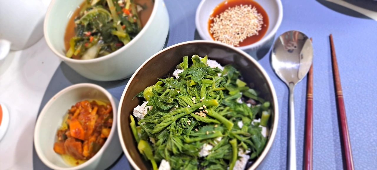 이른 아침 옆지기의 식탁은 콩 잡곡밥 반 그릇에 으깬 두부 , 그리고 데친 참두릅을 얹는다.