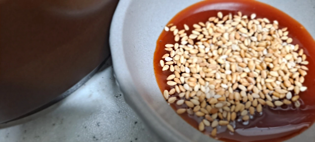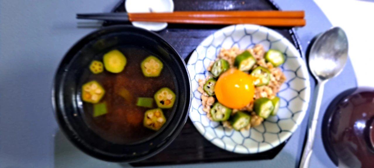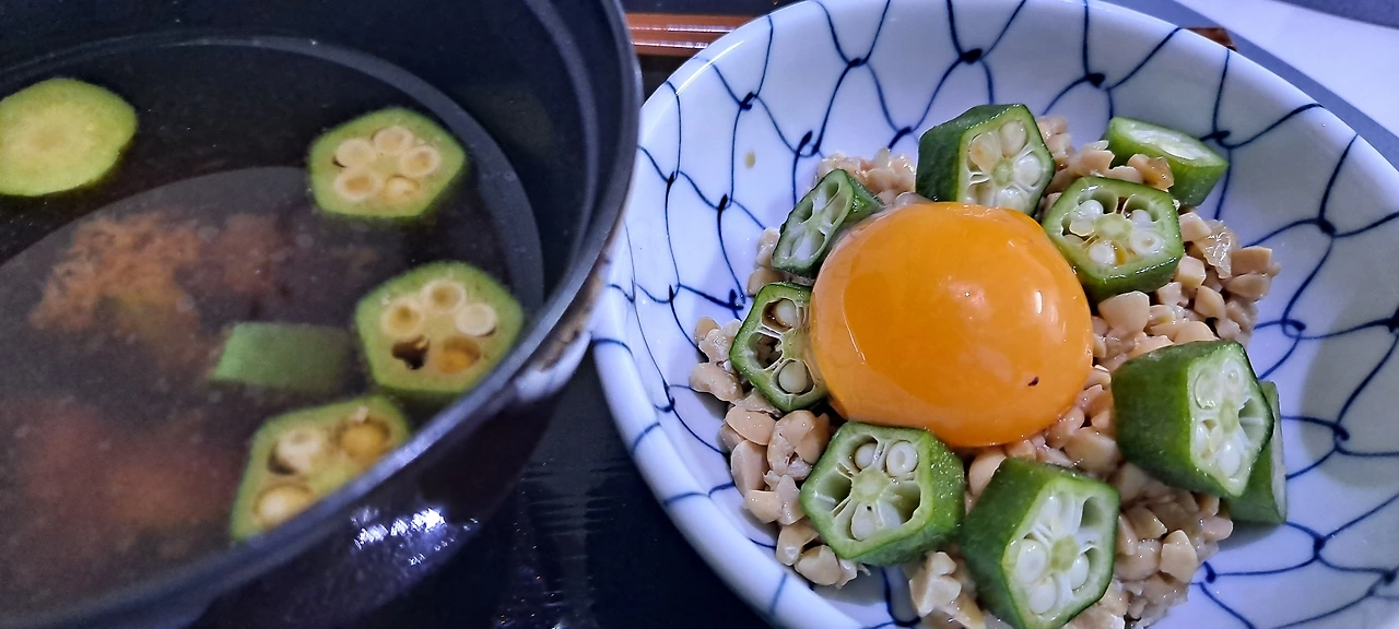 낫또엔 날달걀 노른자와 오크라를 올려본다.