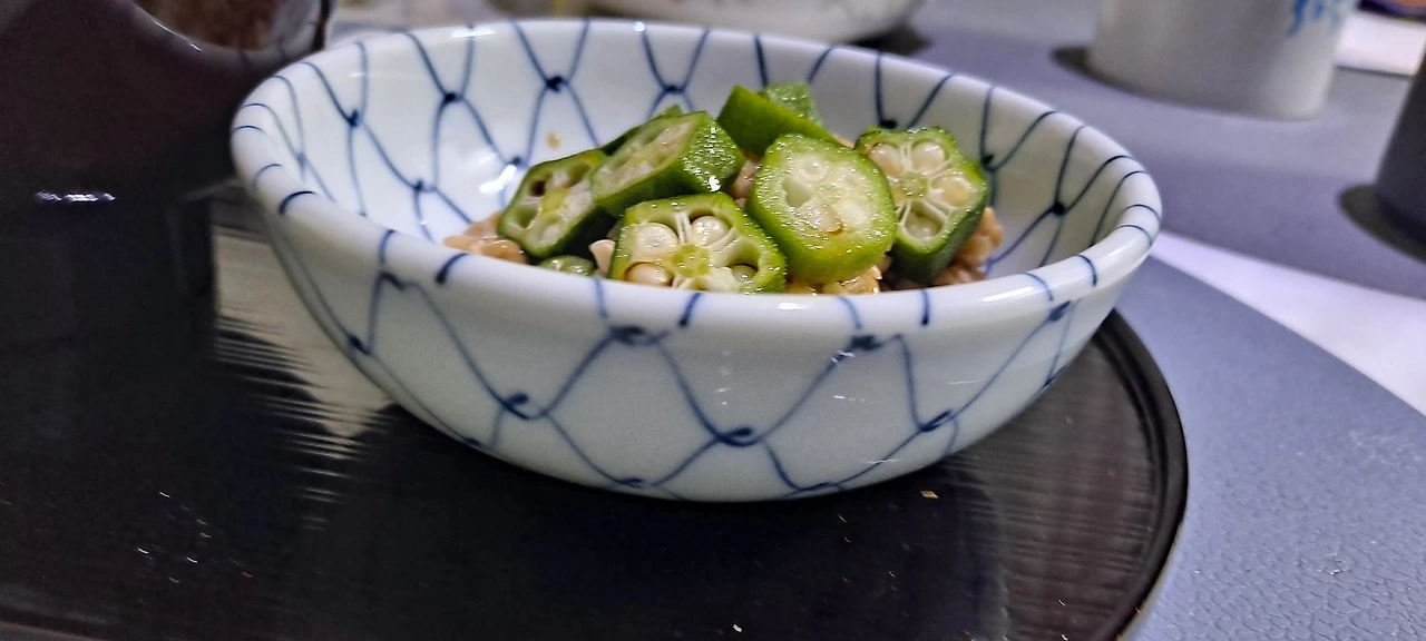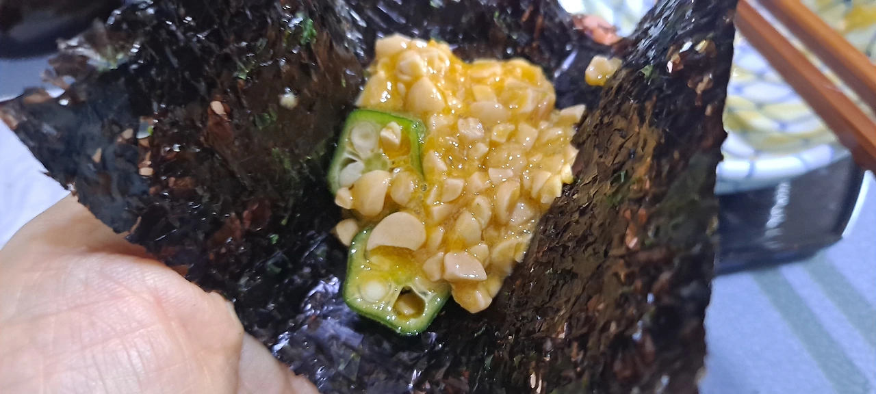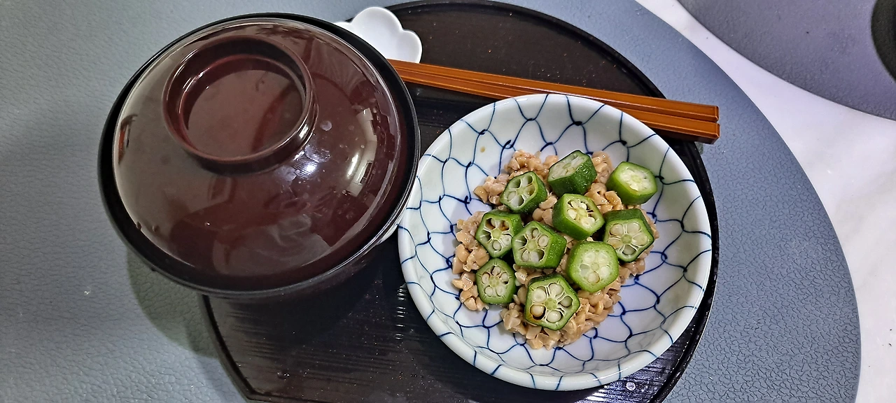 오크라도 집어 들고 , 낫또도 집어넣고...