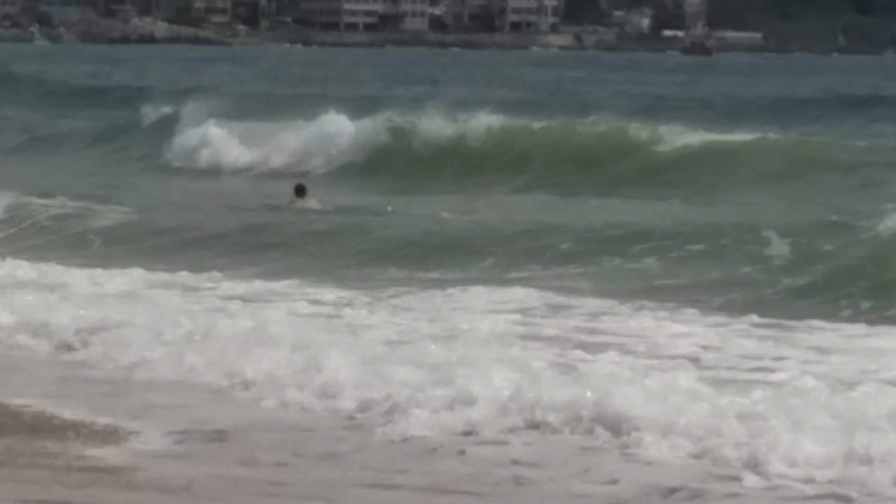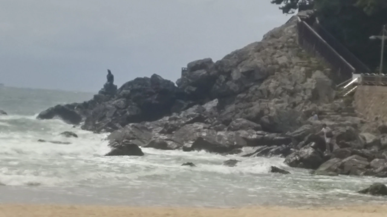 햇살이 조금 이지만 서양인들은 일광욕을. . 거친 파도에 몸을 맡긴 젊은이