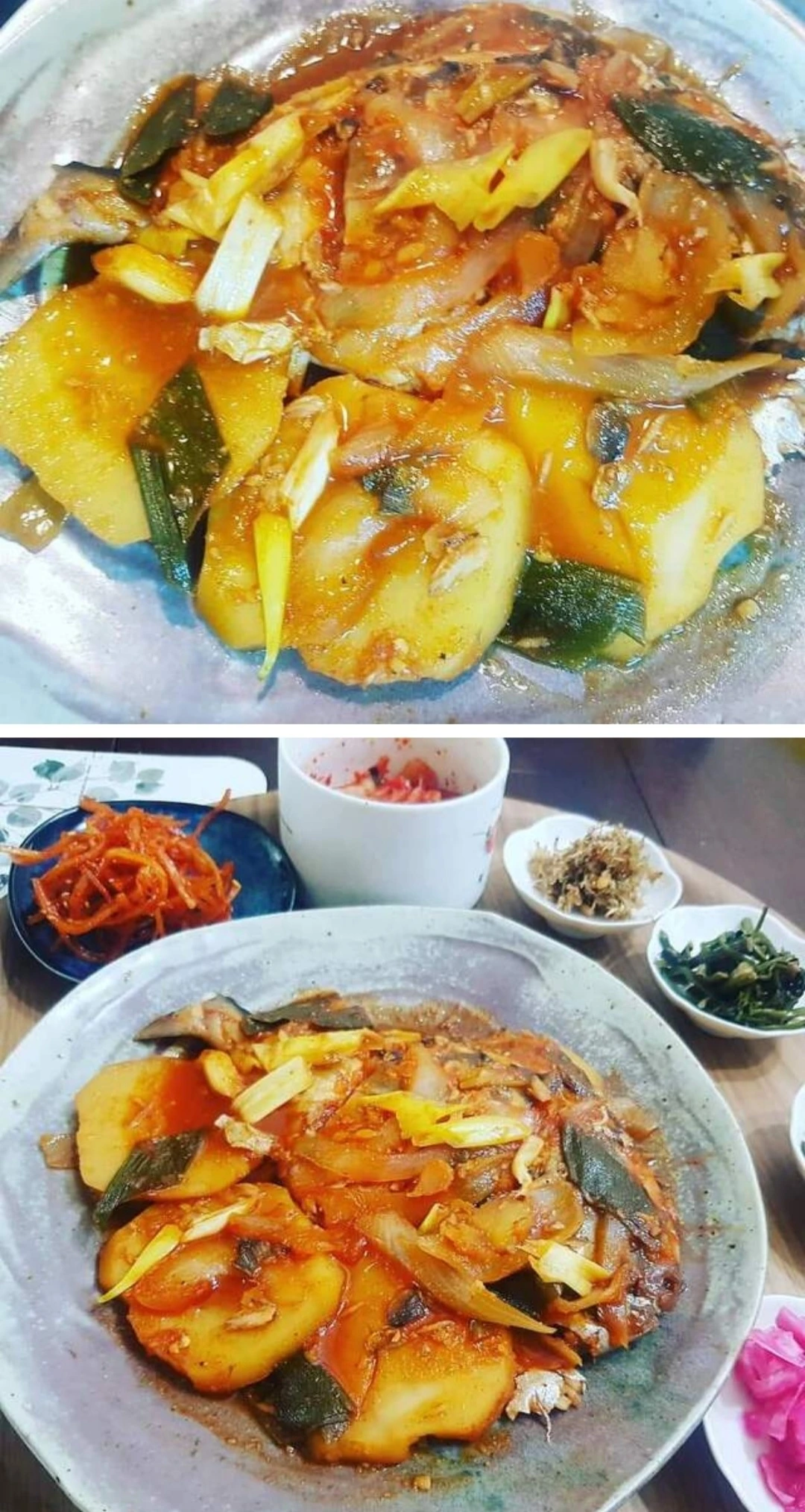 햇 감자와 양파를 깔고,