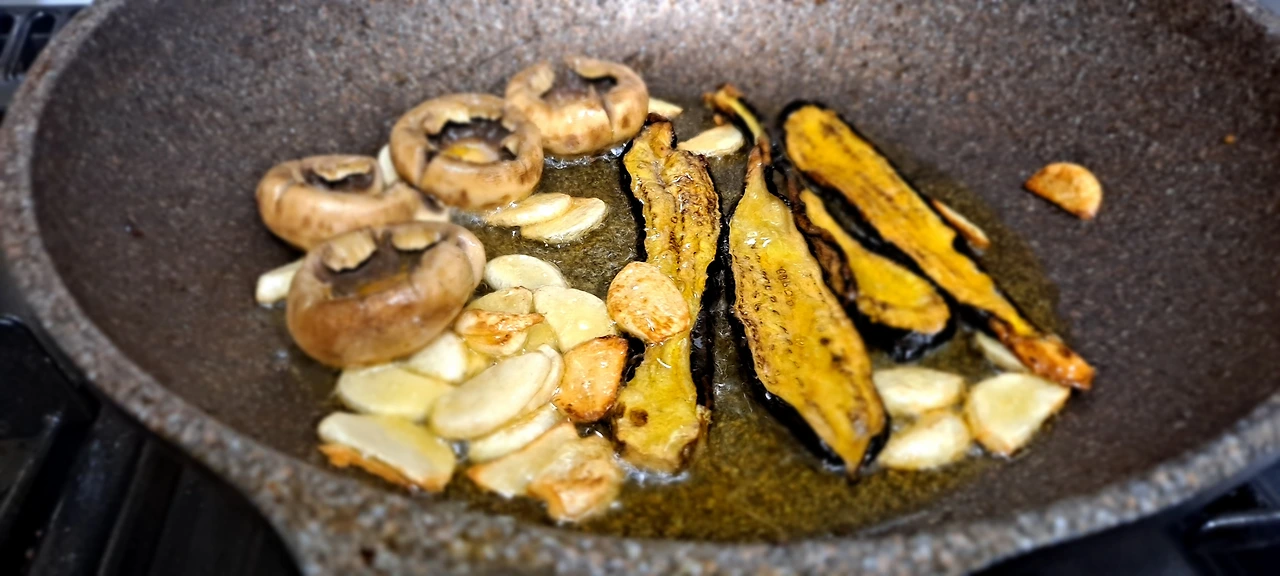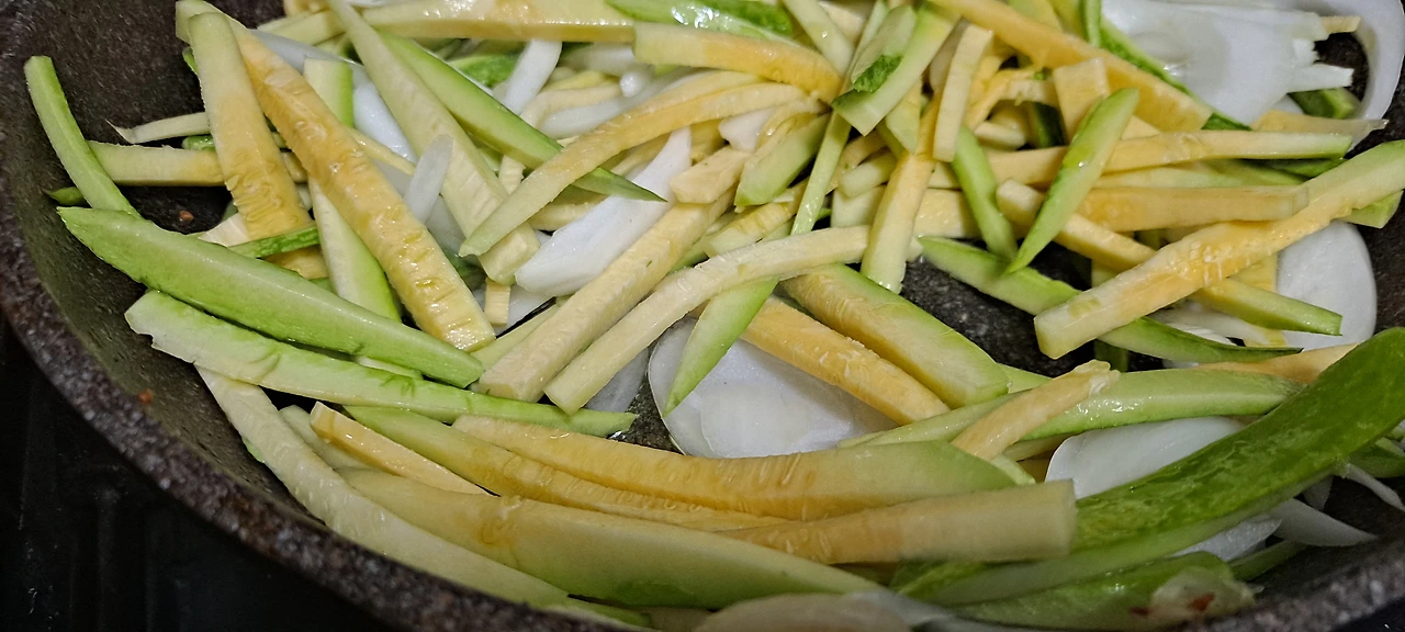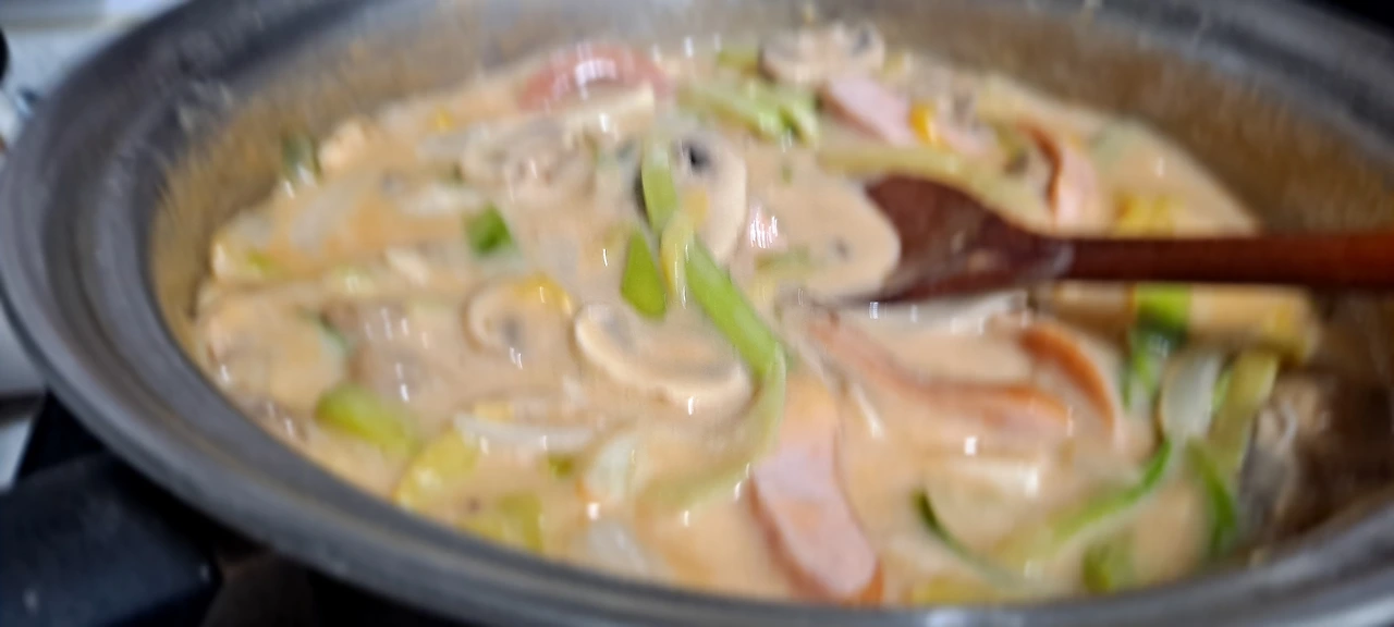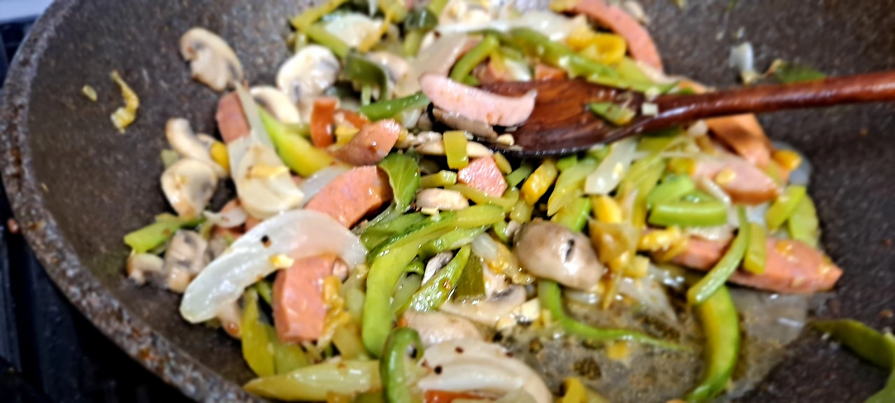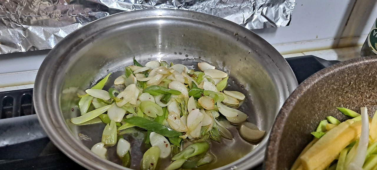애호박을 예쁘게 돌려 깎아얀데 그냥 굵게 채를 치고 양송이와 대파를 가득 , 그리고 소시지도 채를 쳐서