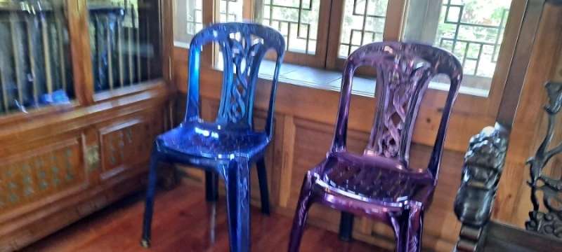가운데의 안락의자는 권위를 나타냈고 , 코믹하게 양 옆으로 퍼랑, 보라 분홍, 황금 의자가 머치 베르사유 궁전에서나 실제로 사용됐을법한 바로크적 느낌을 자아냈다.