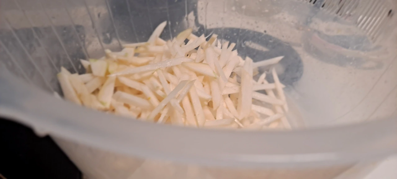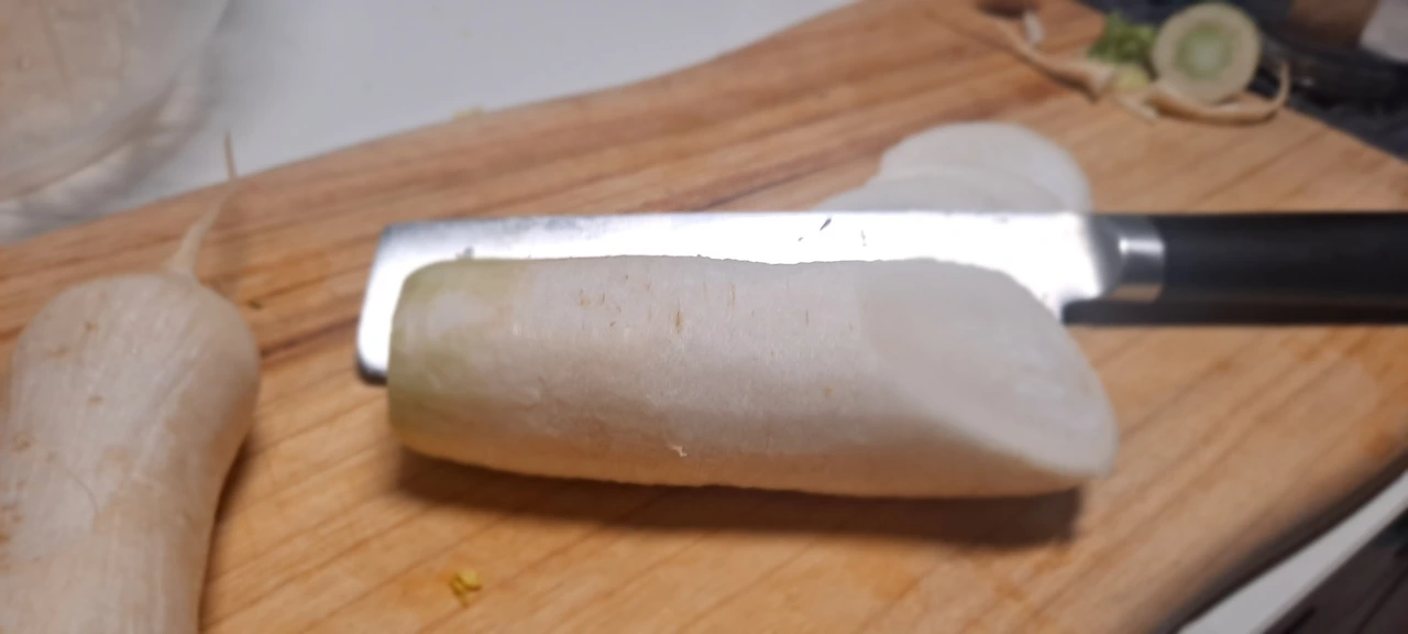 새댁의 지휘 아래 전날 야채를 다듬던 새신랑은 또 열심히 무생채를...