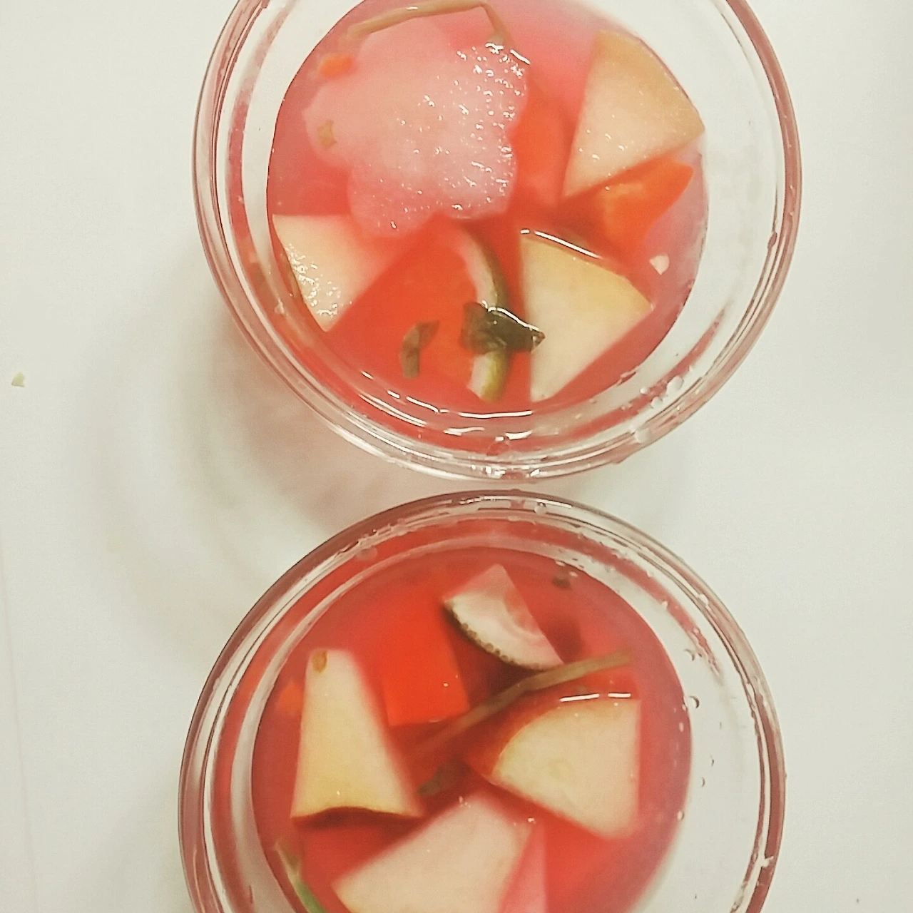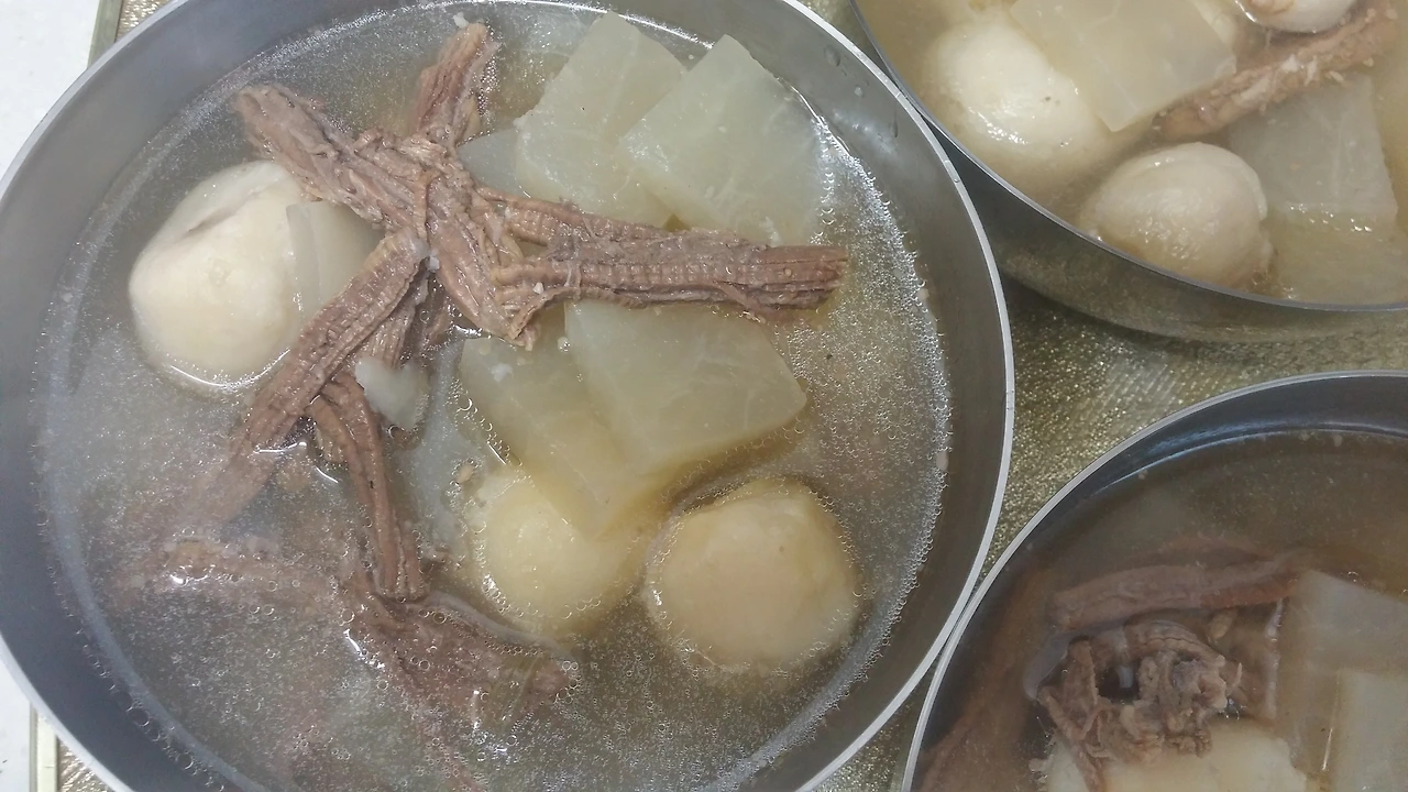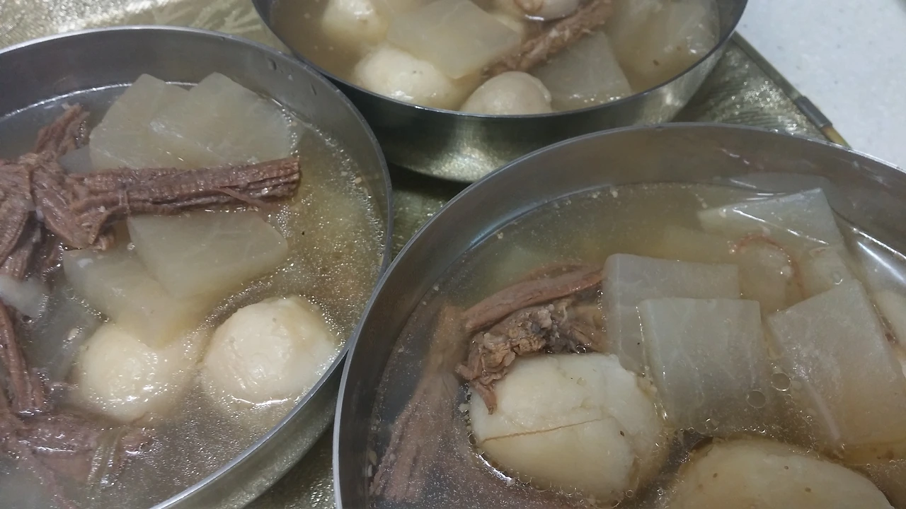 큰 냄비에 무우와 다시마 그리고 양지를 넣어 푸욱 끓인 뒤 양지를 건져내서 손으로 찢어 다진마늘. 국간장.소금. 후추에 조물조물 ,