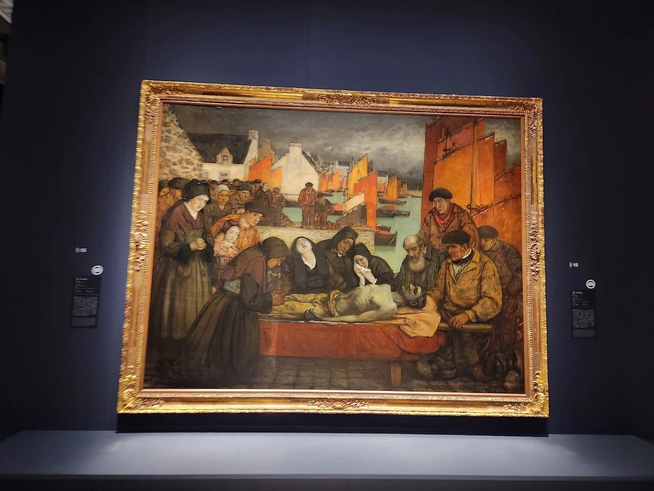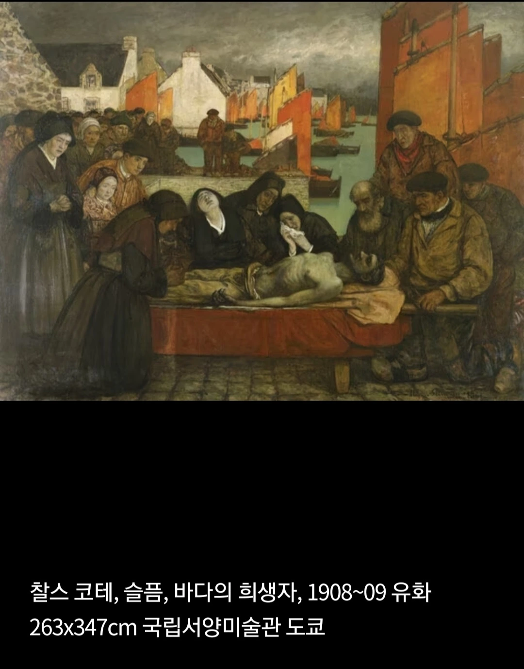 여기에 나비파의 중심이던 모리스 드니(Maurice Denis, 1870~1943)의 브르타뉴의 신화와 풍경 그리고 삶을 그린 작품들이 등장한다. 드니는 브르타뉴에 별장을 장 만해 가족과 함께 자주 오가며 이곳의 전설과 풍토를 특유의 밝고 맑은 신선한 색채로 담아냈 다. 처음 상징주의 화가로 출발했지만. 시간이 흐르면서 상징적이기보다는 장식적이며, 설화적인 내용으로 기독교적인 주제의 종교화를 주로 그렸는데 그의 몽환적인 색채로 빚어낸 브르타 뉴의 이야기가 독특하다. 샤를 코테(Charles Cottet,1863~1925)는 인상파 화가들과 달리 매우 침울한 색채로 브르타 뉴 사람들의 모습을 담았다. 특히 그는 새벽 브르타뉴 항구의 어두운 바다 풍경과 브르타뉴의 농부와 어부의 삶, 그리고 종교활동 등을 화폭에 담았다, 특히 코테의 <슬픔, 바다의 희생 자>(1908~09)는 바다의 비극과 자연의 가혹함을 견디는 사람들을 주제로 많은 작품을 남긴 코테의 대표작으로 해난사고가 끊이지 않는 브르타뉴 생트섬 부두에서 익사한 어부를 추모하는 섬 주민들의 애도가 ‘그리스도의 애도’라는 전통 그림 위에 중첩되어 그려져 있다.