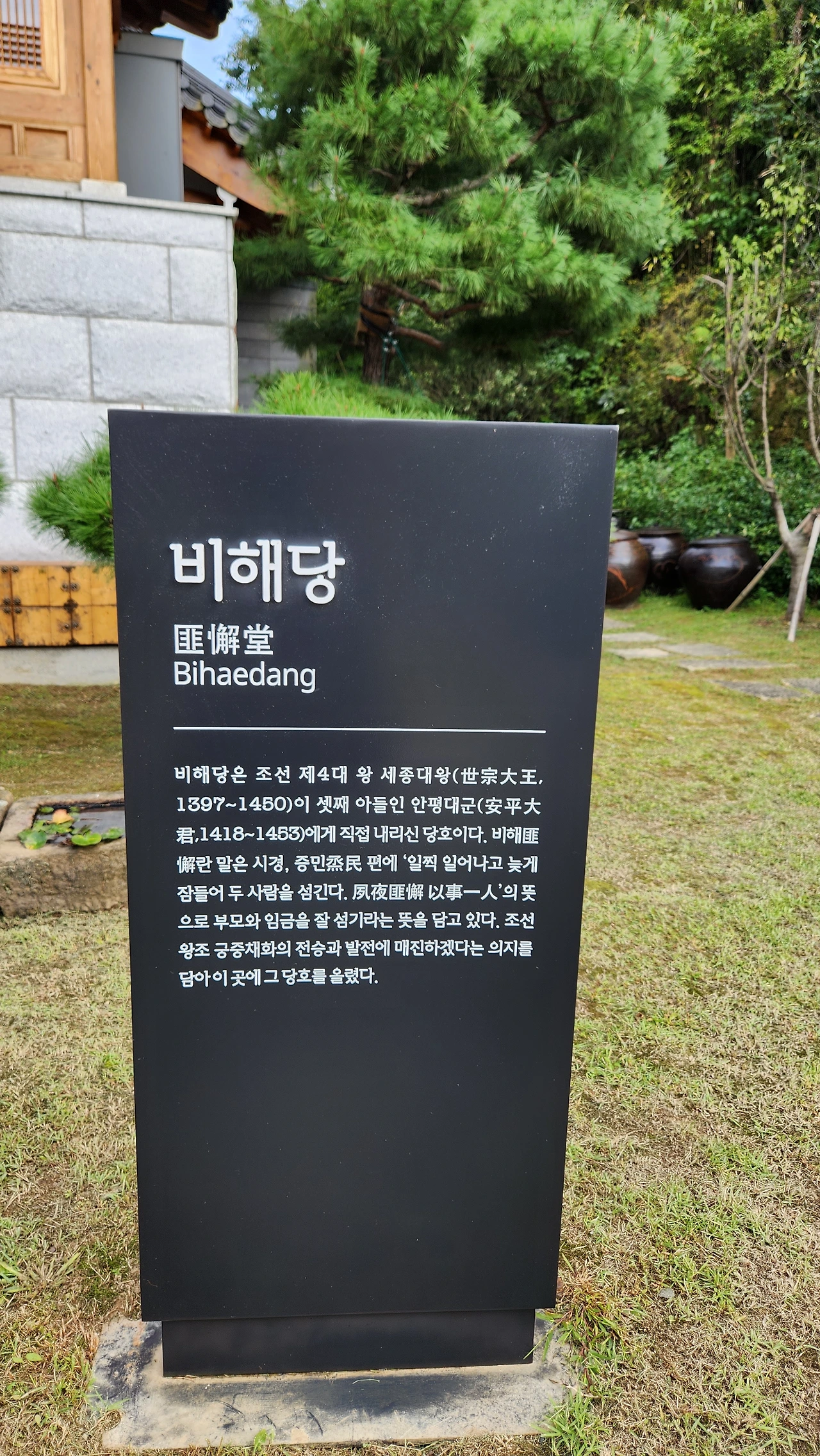 비해당은 세종대왕이 셋째 아들인 안평대군에게 직접 내리신 호이다.비해란 일찍일어나고 늦레 잠들어 두사람을 섬긴다이 뜻으로 부모와 임금을 잘 섬기라는 뜻을 담고 있다.