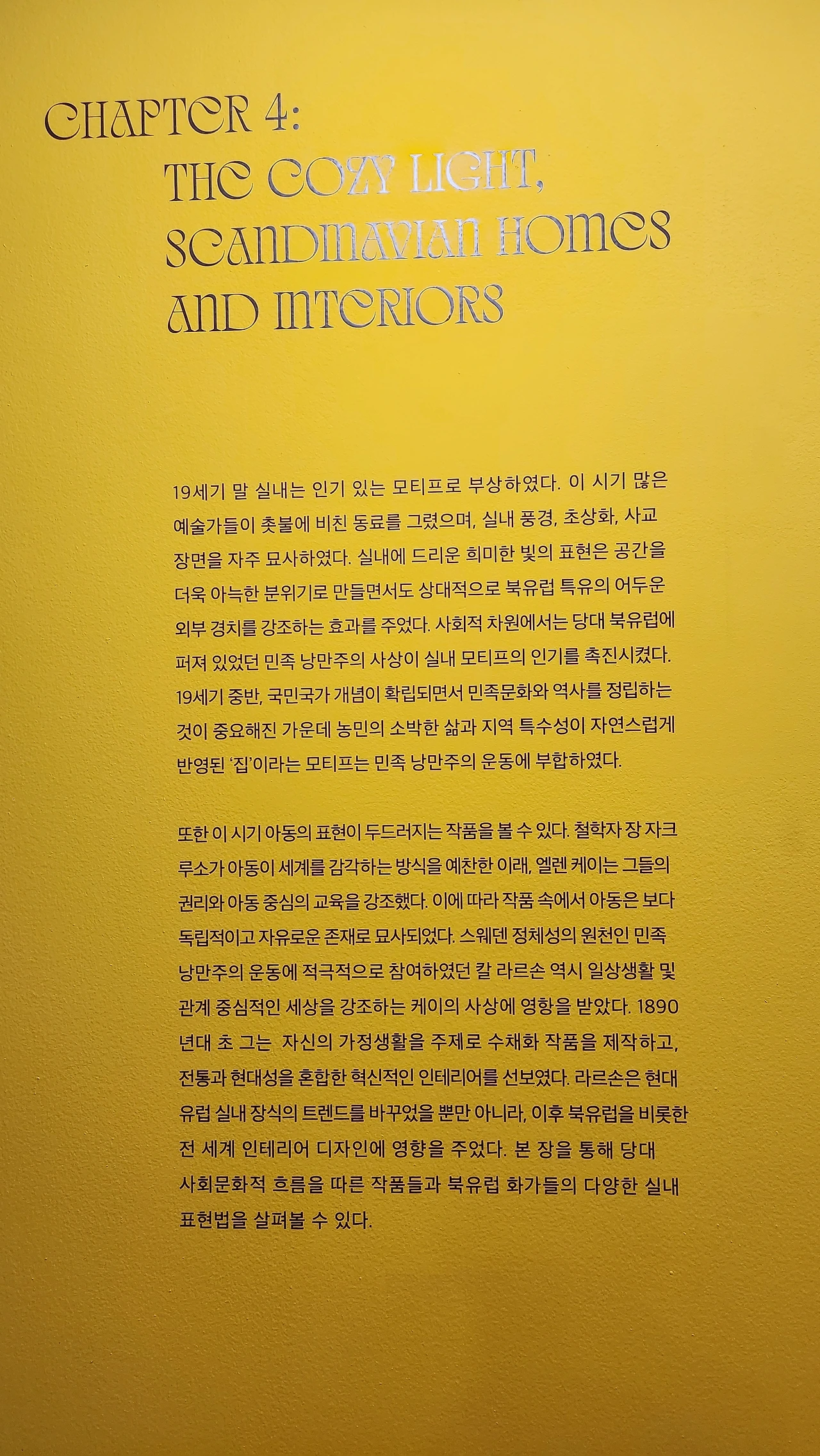 이번 전시는 스웨덴 국립미술관과 마이아트 뮤지엄이 협업한 전시로서 스웨덴의 국민 화가 칼 라르손을 포함한 한나 파울리, 앤더스 소른 , 칼 빌헬름손, 휴고 삼손, 외젠 얀손, 요한 프레드릭 크류텐, 브루노 릴리에 포르스, 라우리츠 안데르센 링, 한스 프레드릭 구데 등 스웨덴, 덴마크, 노르웨이를 대히표하는 예술가들의 79점의 명작을 선보인다.