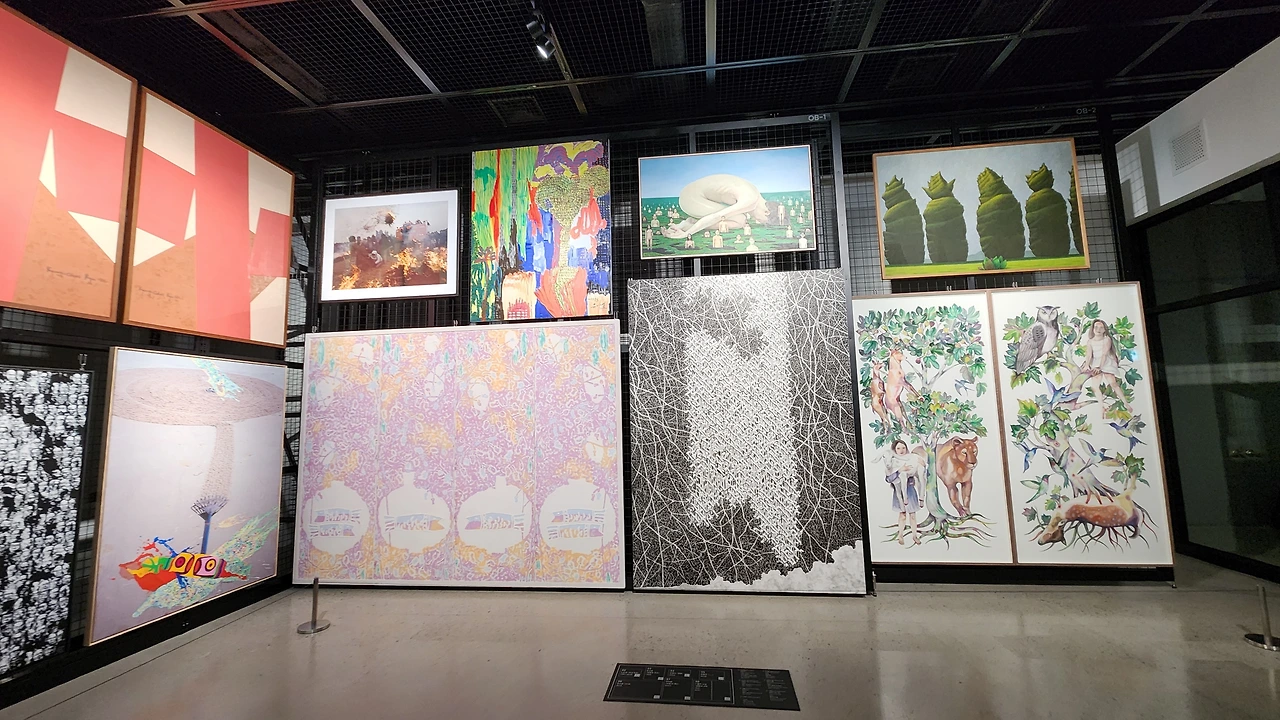김정욱작가, 김호득작가, 임재광작가, 이재호작가, 김영진작가, 이응노화백, 류경채작가, 김선태작가, 구나작가, 이대원작가, 정장직작가, 정의철작가, 박능생작가, 김동유작가, 허진궈작가(님)의 작품들로 3면이 가득 차 있었다.