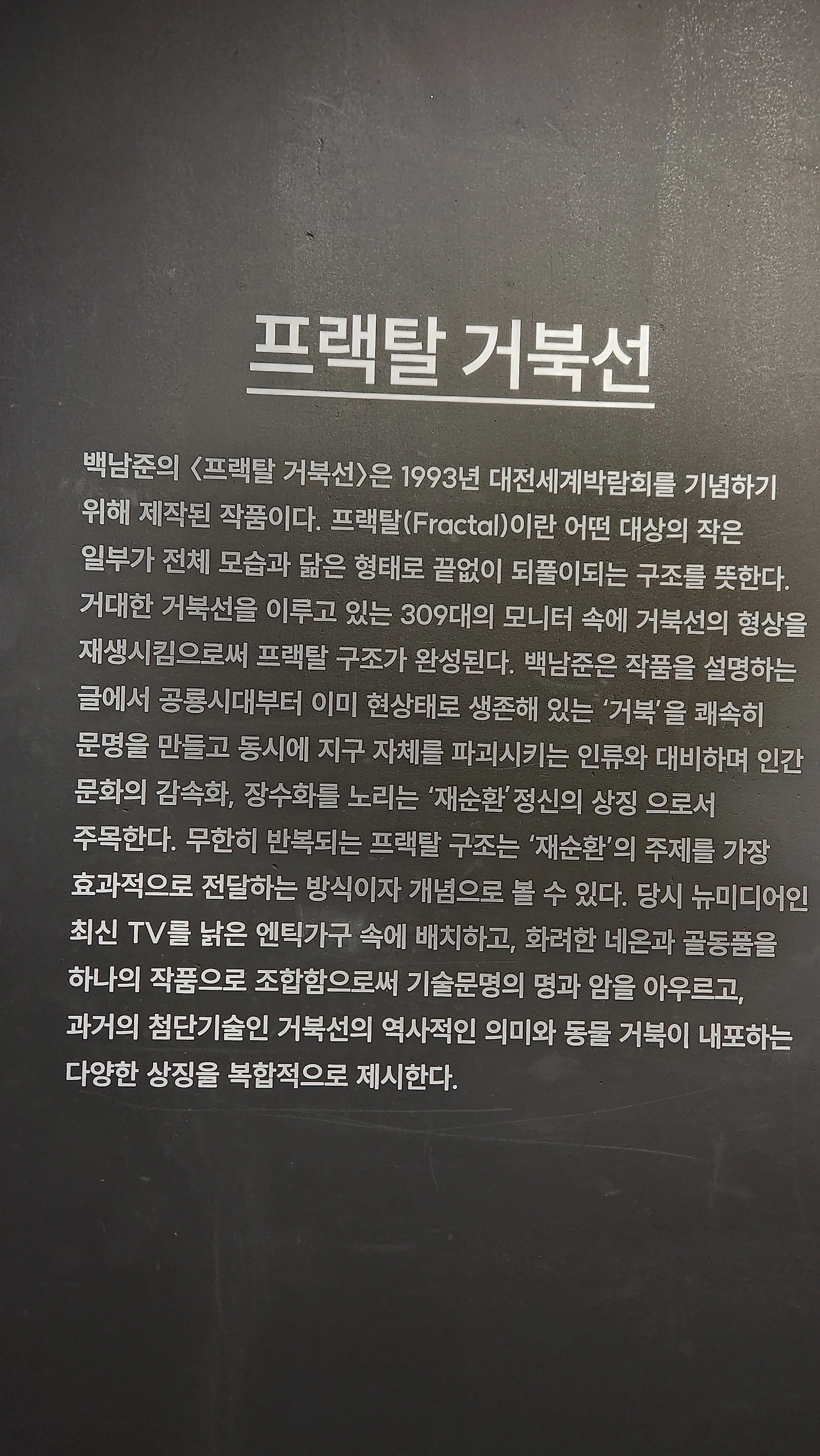 또한 대표소장품인 백남준의 [프릭탈거북선]을 필두로 연 2회 소장품을 교체하여 시민들에게 공유하고 심화연구 외 이햐를 높이는데 주력하고 있다
