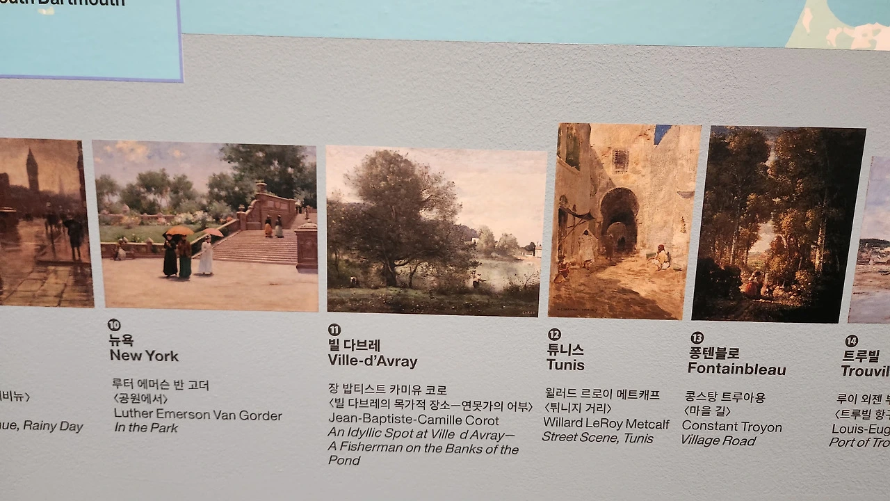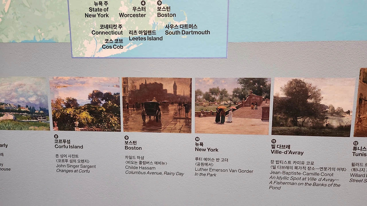 차일드 하삼(Childe Hassam), 메리 카사트(Mary Cassatt), 시어도어 로빈슨(Theodore Robinson), 로비스 크린트(Lovis Corint), 폴 시냐크(Paul Signac), 요제프 이스라엘스(Jozef Israels), 알프레드 시슬레(Alfred Sisley), 카미유 피사로(Camille Pissarro), 샤를 프랑수아 도비니(Charles Francois Daubigny), 줄리앙 뒤프레(Julien Dupre)등 작가들은 뉴욕의 거리, 보스턴의 해안, 뉴잉글랜드의 햇살을 인상주의적 감각으로 담아내며 프랑스 인상주의와는 다른 결의 빛을 창조했다.