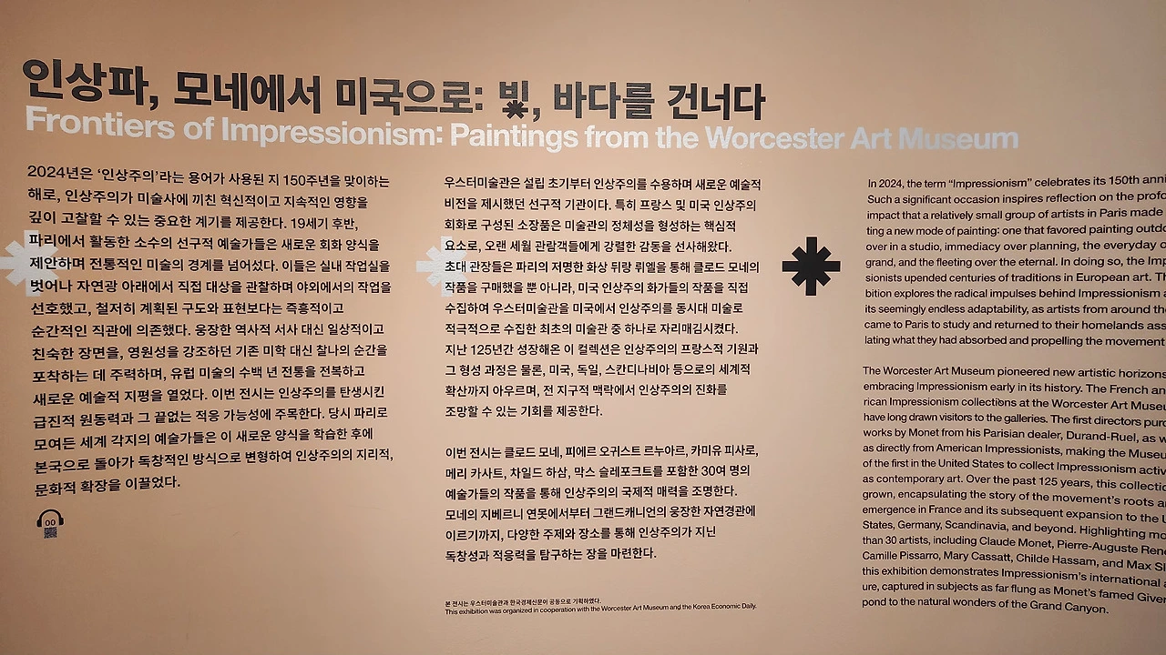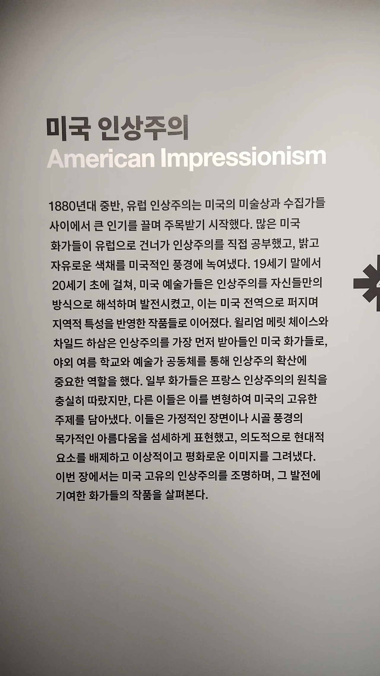 전시는 모네와 세잔 등 유럽의 거장들에게서 시작된 빛의 씨앗이 어떻게 미국이라는 새로운 땅에서 연결되어 피어나는지 세심하게 조망한다. 19세기말에 유럽에서 미술을 공부하고 돌아온 미국 화가들은 단순 모방에 그치지 않고, 자국의 도시와 풍경을 그들만의 시선으로 그리기 시작했다.