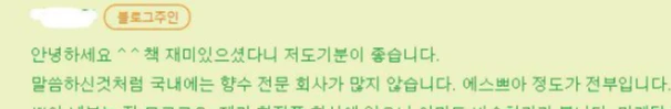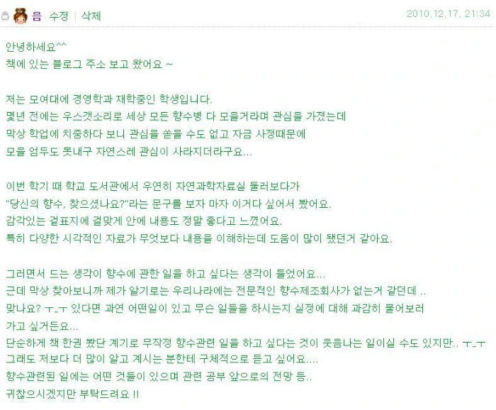 이 책은 나에게 휘향 찬란한 향수 세계에 눈을 번쩍 뜨게 하는 심봉사의 공양미 삼백석과도 같은 존재였다. 이 길이 곧 내 길이라고 느낀(지금 와서 생각해 보니 '착각한') 나는 한참 뒤에 이 책의 저자가 운영하는 블로그에 가서 긴 안부글을 남겼다.