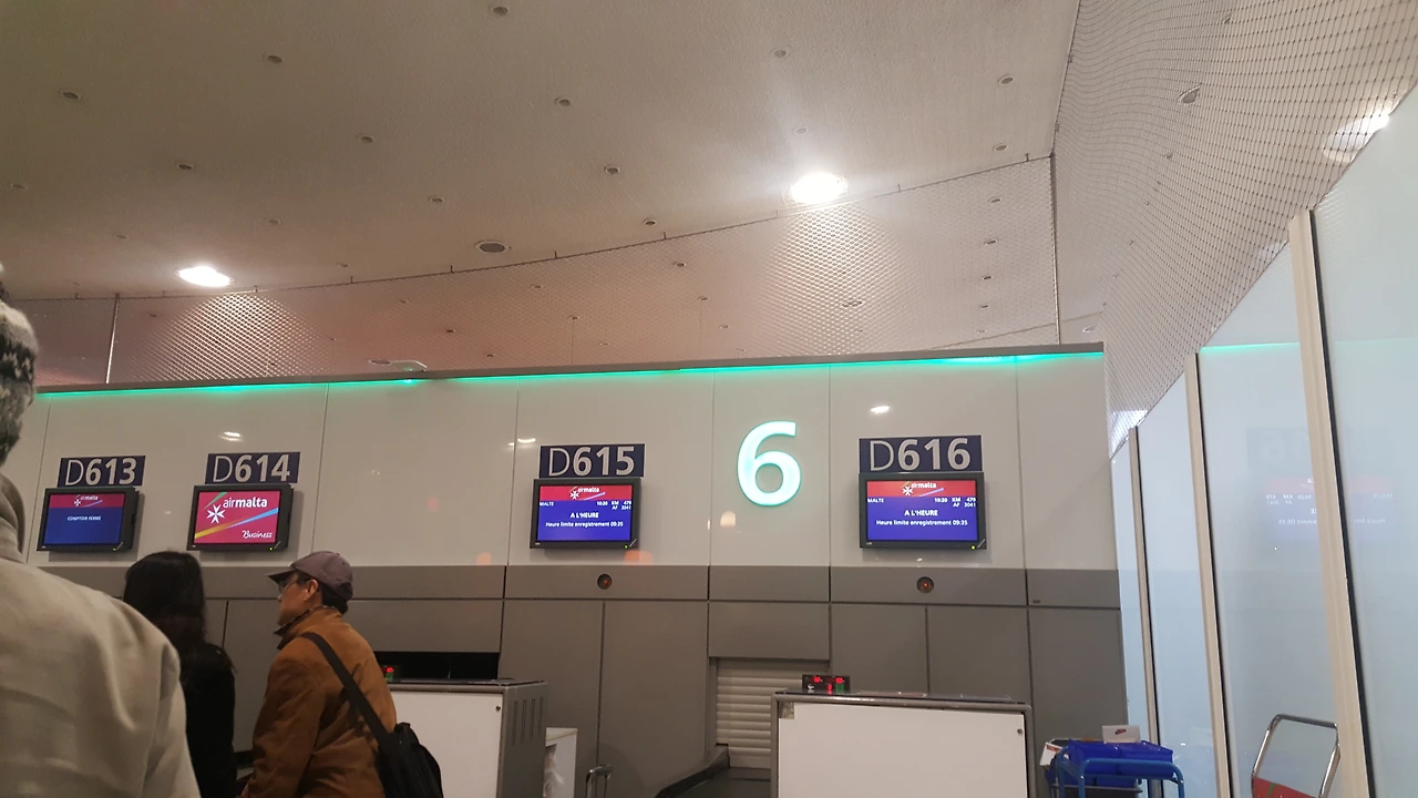 갑자기 몇몇 사람들이 우르르 몰려가길래 궁금해서 따라가 봤다. 5번 게이트에 체크인 카운터가 오픈 준비를 하고 있었다. 순간적으로 그곳이 6번이라 생각하고 줄을 섰다. 근데 점차 내 차례가 가까워졌을 때 다시 확인을 해보니 에어 몰타 로고가 아니었다. 그래서 5번 체크인 카운터 앞에 있던 줄에서 서둘러 빠져나왔다.
