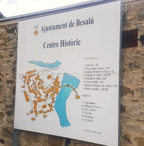 베살루에 다 왔을 때쯤 먹구름이 몰려오고 있었다. 마을 앞에 도착해 차에서 내리니 비가 한두 방울씩 내리기 시작하더니 이후에는 꽤나 굵은 빗방울이 떨어졌다. 우산을 갖고 있지 않아서 마을 초입부 관광 안내소에서 받은 지도를 우산 삼아서 가리고 다녔다.