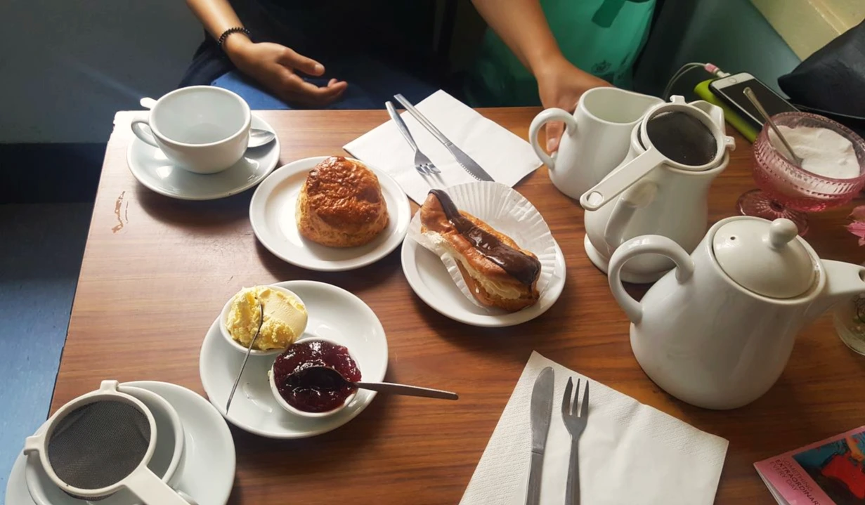 메종 베르토 근처 길가에서 만나 카페 안으로 들어갔다. 안내를 받기 위해 입구에서 기다리고 있는데 사장님은 뭐 때문인 건지 화가 잔뜩 나 계셨다. 우리는 각각 홍차 한잔씩 시키고 전날에 못 먹은 스콘과 겉에 초콜릿이 발라진 빵을 주문한 후 2층으로 올라갔다. 그러면 사장님이 직접 차와 디저트를 올려다 주셨다. 쩡A는 홍차에 우유를 넣어 밀크티로 마셨고 나는 홍차 그대로의 맛을 느끼고 있었다. 엄청 대단한 건 아니지만 맛있었다. 이날도 우리만의 티타임을 즐길 수 있게 된 것에 감사했다.