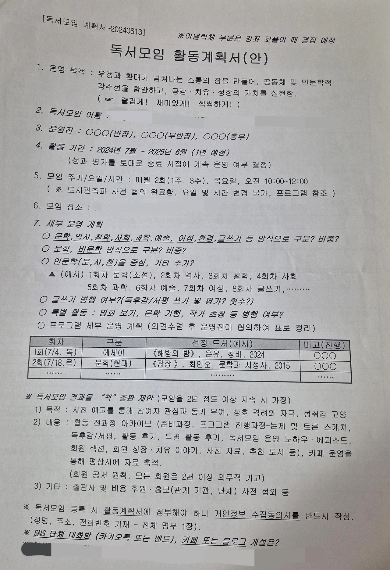 사실 잘 운영될 것 같은 믿음이 생기기도 했다. 도서관이라는 장소까지 도서관 관계자와 의논해 오신 회장님, 체계적인 계획서, 회원들의 걱정을 고려한 회장님의 발제문까지. 무엇보다 회장님께서 구심점 역할을 잘 해주실 거라는 믿음이 생겼다. 더군다나 선생님도 우리를 보시며 이 모임이 정말 잘 운영될 것 같다는 말씀을 하셨다.