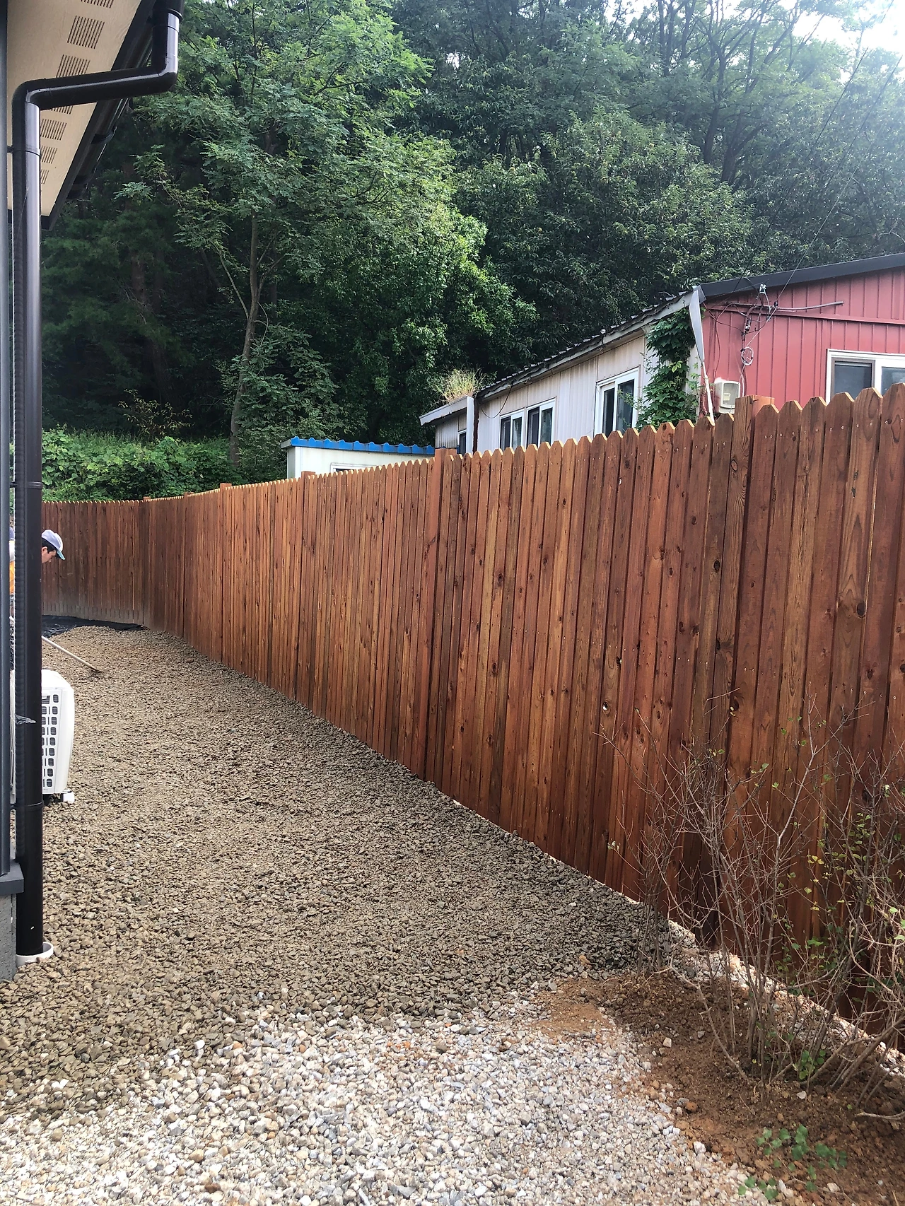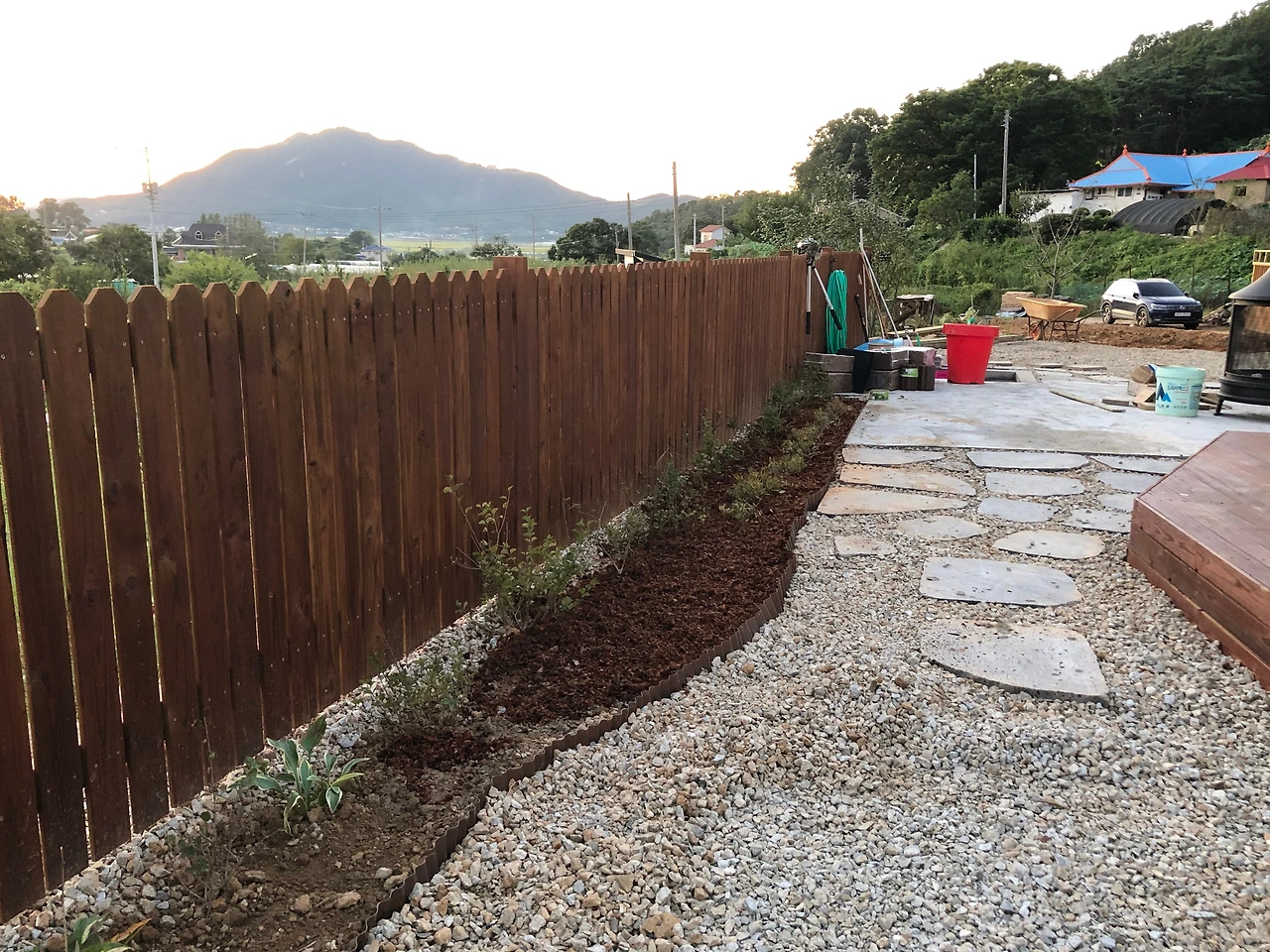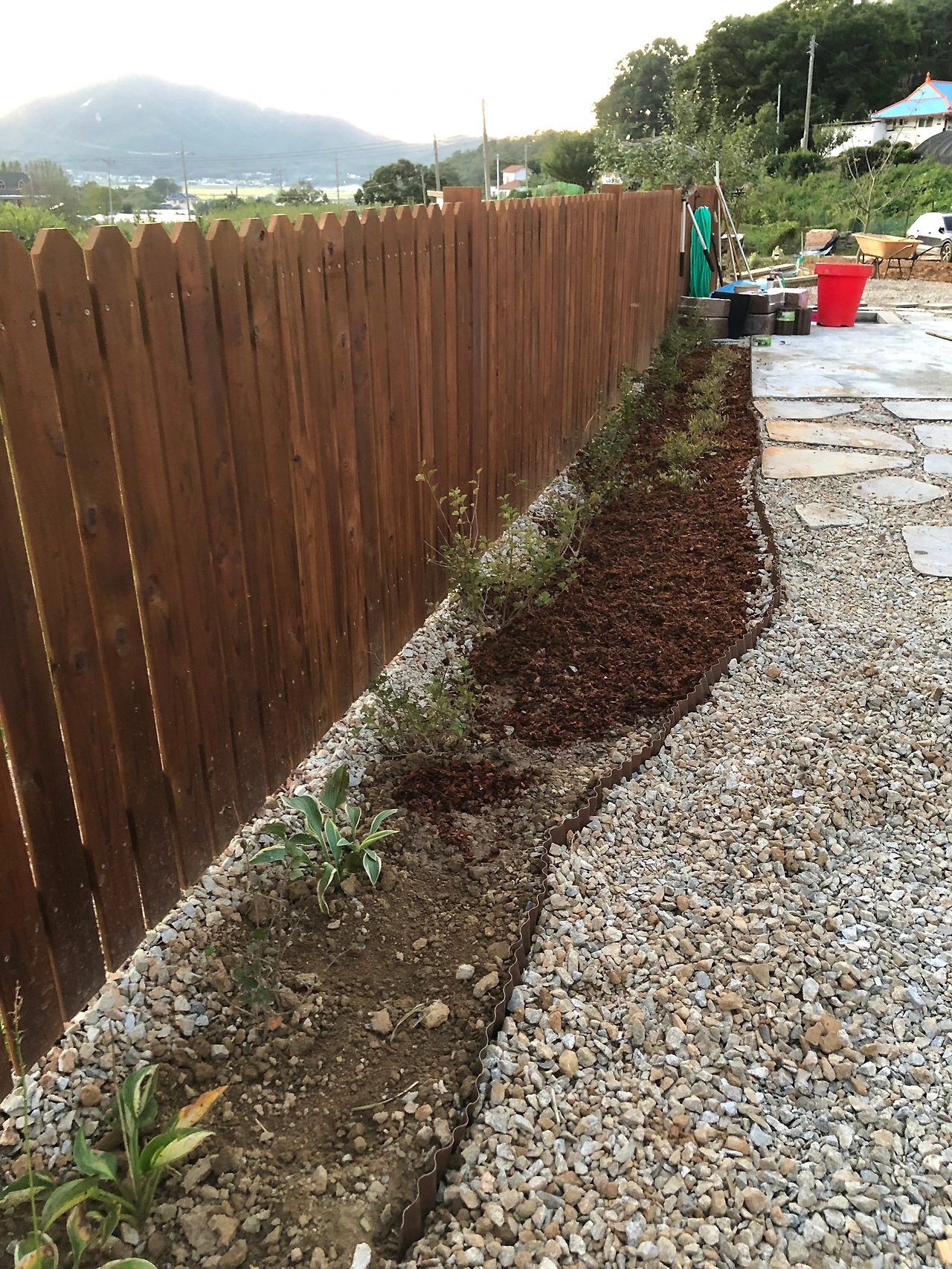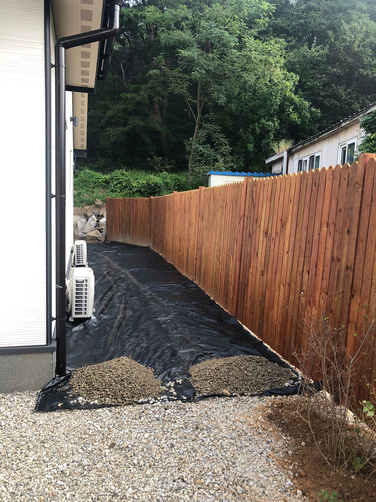 집 옆이에요. 이곳과 뒷마당은 꽃이나 나무는 안키우기로 결정해서, 잡초관리도 쉽게하려고 제초매트를 깔고 자갈돌을 덮었습니다. 그럼에도 자연은 돌틈에서 싹을 틔우겠지만, 관리는 쉬울 꺼에요.