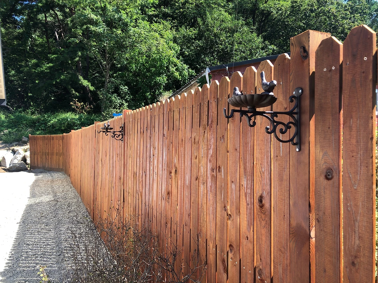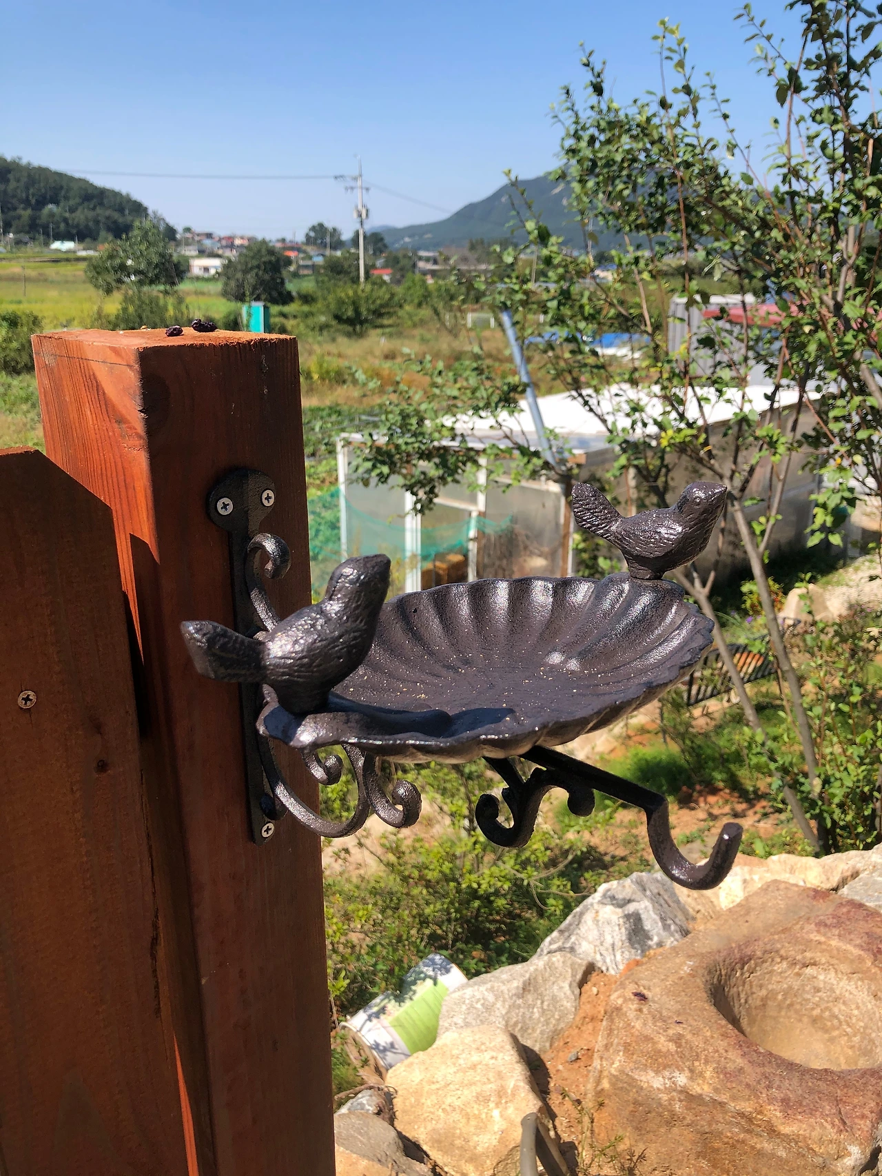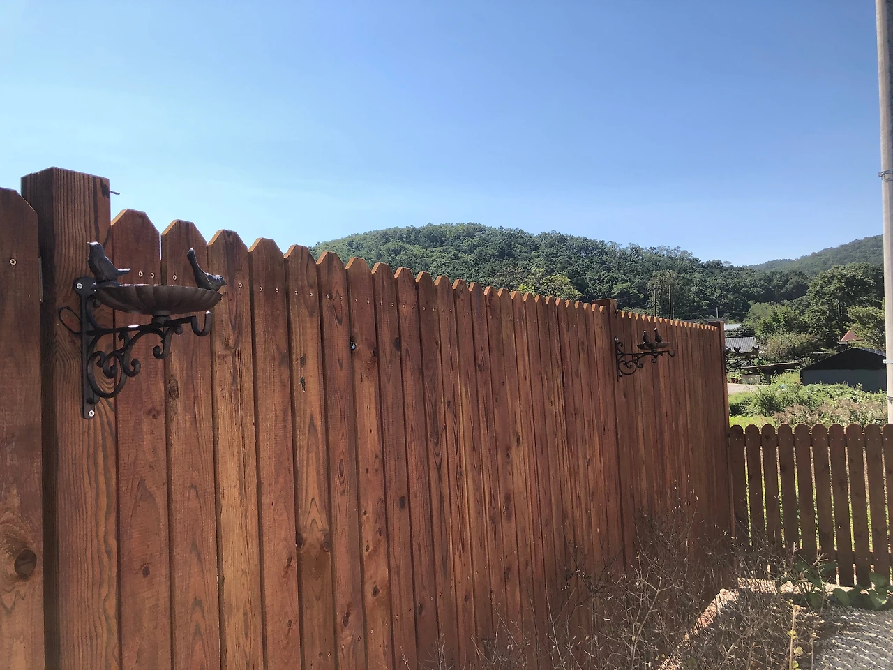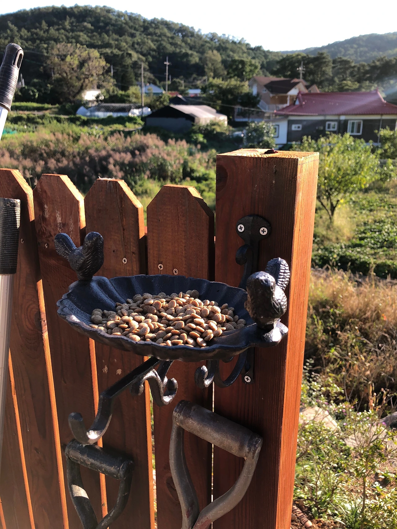다는 김에 새들을 위한 식탁도 담장에 달아놓았어요. 새들이 자꾸 길고양이 밥그릇을 탐내는데 현관앞 포치가 새똥으로 더러워지는 것은 괜찮은데, 지난번에 고양이에게 당했는지 물까치 한 마리가 죽어있더라고요. 분리를 해줘야할 듯해서 오신김에 냉큼 달았습니다.
