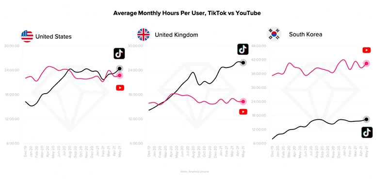 한국은 아직 틱톡과 유튜브의 사용 시간 차이가 아직 크다. 미국에서는 틱톡이 미세하게, 영국에서는 틱톡이 유튜브를 크게 앞지른다.