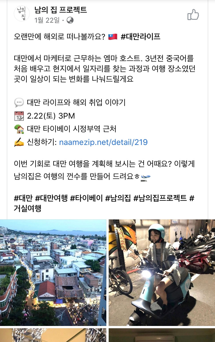 ‘남의 집’과 협력하여 타이베이에서 남의 집을 열어 내 대만생활 이야기를 공유하려고 했으나 코로나 사태로 아쉽게 불발되었다. ^^; 강연, 소셜 활동은 다음에 다시 도전하고 싶은 분야다.