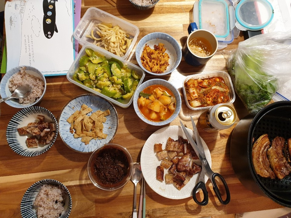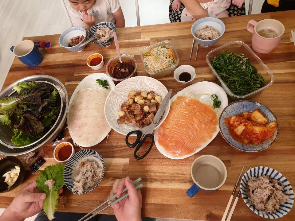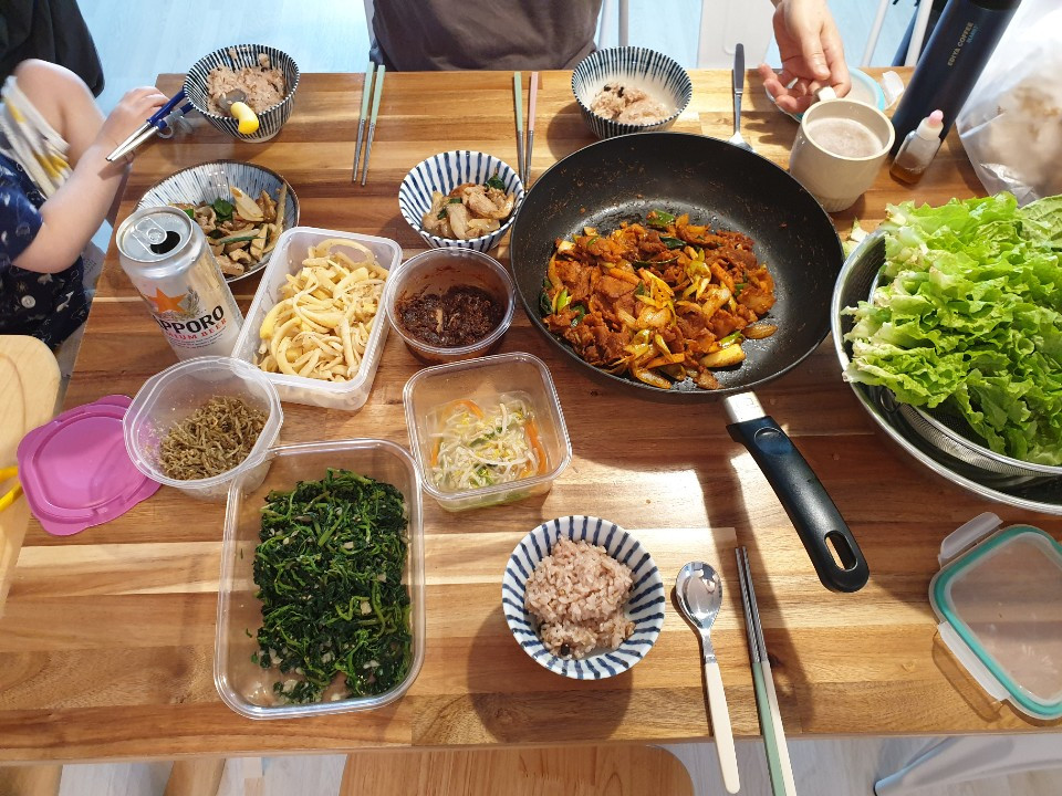 제주도 재래시장에서 샀던 생선, 고기, 야채들로 요리를 하니 맛이 없을 수 없었고, 낯선 곳에 와서 기분도 좋으니 밥이 술술 넘어갔으리라. 모든 걸 잘 먹어줬던 지후와 모든 걸 몸속에서 흡수시키고 뼈와 살이 되게 해준 아이의 몸에게 너무 고마운 순간들이었다.