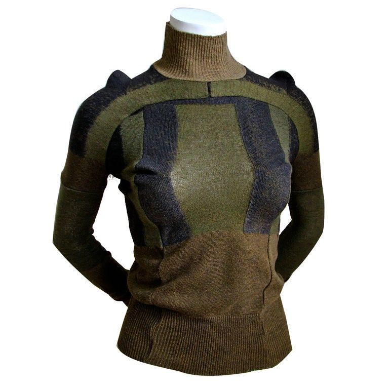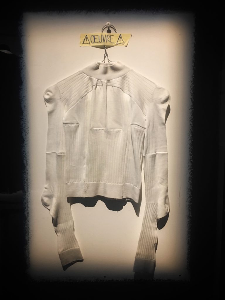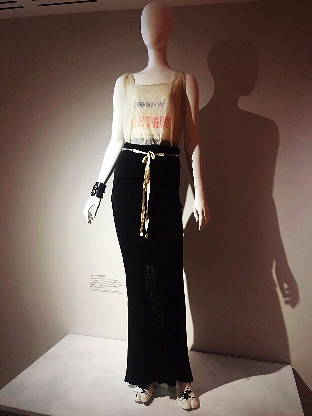 펑크 스웨터 스타일을 자세히 보면 그 아래에 검은 드레스를 볼 수 있습니다. 이 드레스도 눈여겨볼 점이 있습니다. 이전에는 의복의 내부 안감으로 간주한 것을 표면으로 나타내 옷에 더 중요한 역할을 부여한 것입니다. 오늘날, 마틴 마르지엘라의 옷을 보면 복잡하고 불편한 옷으로 생각하기 마련인데 이외로 그는 편안함과 단순함의 가치도 소중히 여겼고 영감을 얻기도 했습니다.