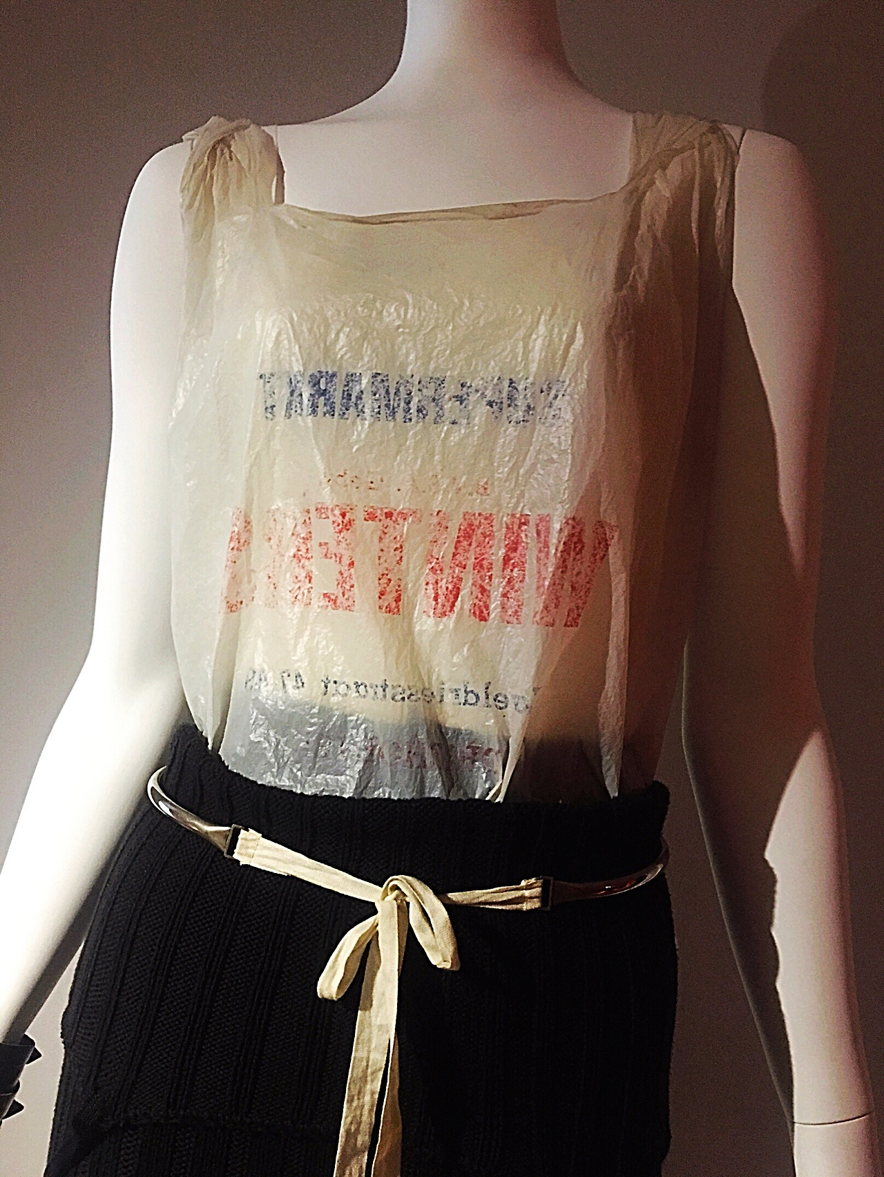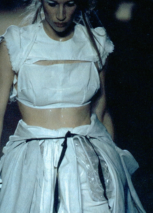 마틴 마르지엘라는 특이한 오버사이즈룩을 선보이기도 했습니다. 네트 티셔츠 아래 주름진 오버사이즈 탱크톱을 입혔으며 사람들은 이를 ‘뉴 웻룩’이라 불렀죠. 또한, 사람들이 옷이 도착했을 때 비닐 안에 있는 옷을 보면 매우 신나는 것에 영감을 받아 옷을 비닐 커버를 그대로 남겨놓기도 했습니다. 심지어 슈퍼마켓 비닐봉지를 사용하여 민소매를 만들었습니다. 또한 플라스틱 봉지로 핸드백을 만들었죠. 여태껏 볼 수 없었던 직물에 대한 발상의 전환이였습니다.