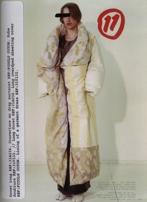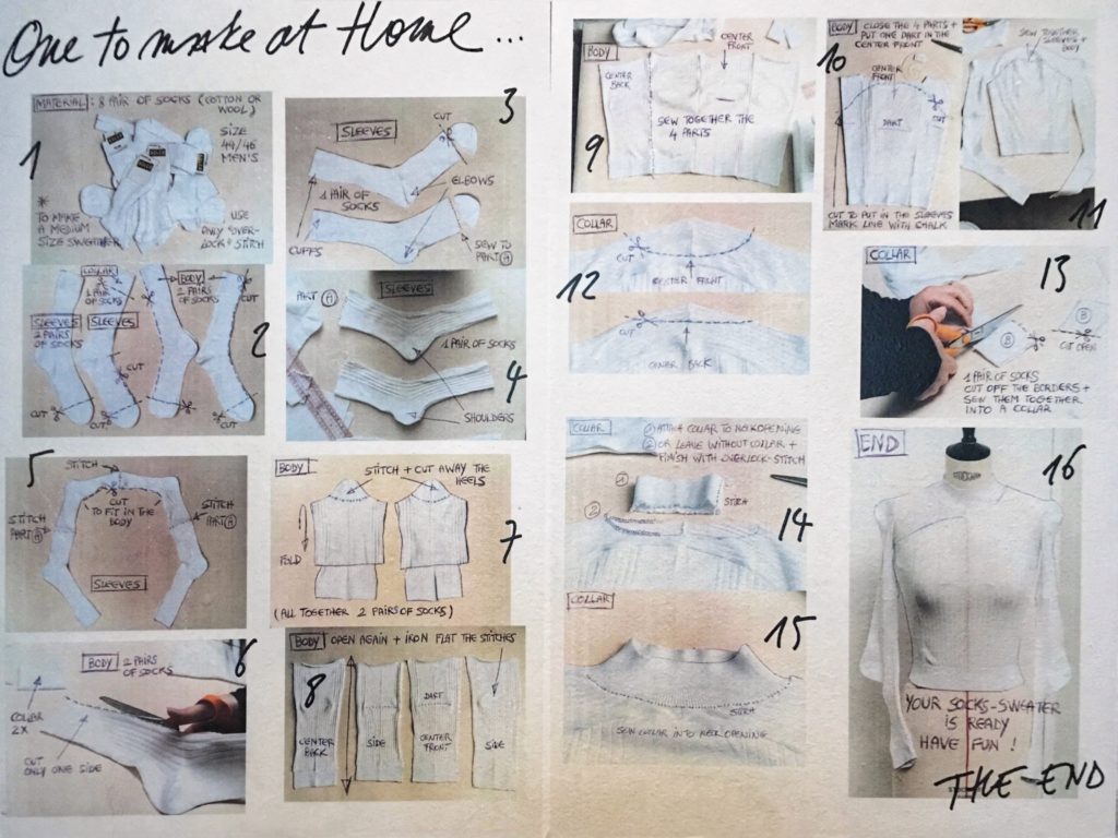 1991년 겨울 패션쇼에 다시 니트를 만드려고 했으나 적절한 니트 공급 업체가 없었고 새로운 방식으로 니트 제작이 필요했습니다. 학창 시절 마틴 마르지엘라는 과제로 기존 주방 소재로 옷 만들었죠. 그는 티타월로 자켓을 만들었는데 티타월 안에 패턴을 자르고 싶지 않아서 전체를 사용해 그냥 접거나 조각으로 붙였습니다. 마틴 마르지엘라는 이 방식을 양말로 활용하여 니트를 만듭니다. 또한, 제작 과정의 모든 단계를 볼 수 있는 설계도도 선보이며 다른 사람들도 직접 만들어볼 수 있게 방법을 알리기도 했습니다.