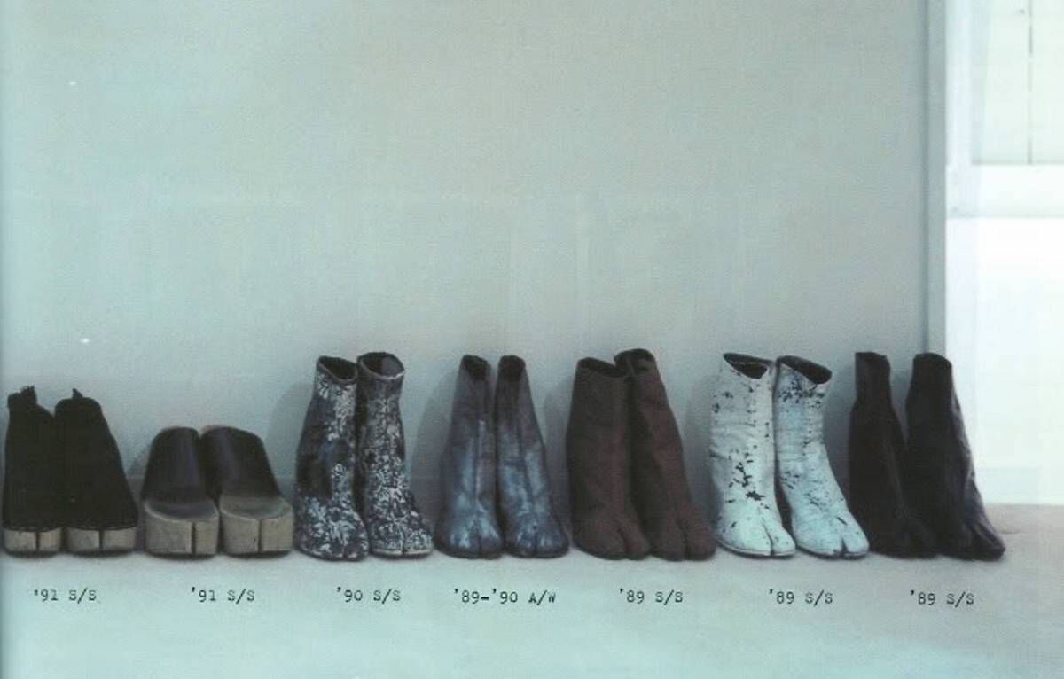 마틴 마르지엘라와 동업자 제니 메이렌스는 레이 카와쿠보를 비롯해 일본 디자이너들을 동경했습니다. 그래서 일본으로 여행 다니며 일본의 복식으로 영감을 많이 받습니다. 도쿄에 길거리에서 면으로 된 플랫 타비 신발을 신고 있는 노동자로부터 영감을 받아 부드러운 타비 신발을 튼튼한 가죽으로 제작한 하이힐로 만들었죠. 이는 타비로 된 최초의 하이힐 모델이었습니다. 나중엔 하이힐이 아닌 운동화로도 나오죠.