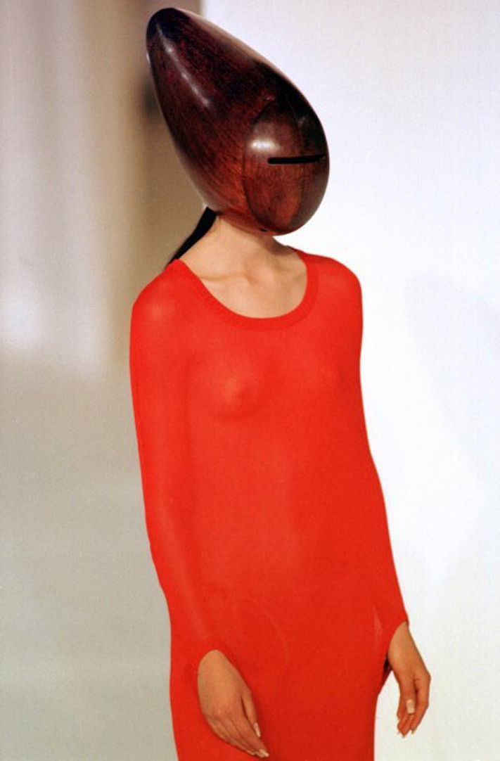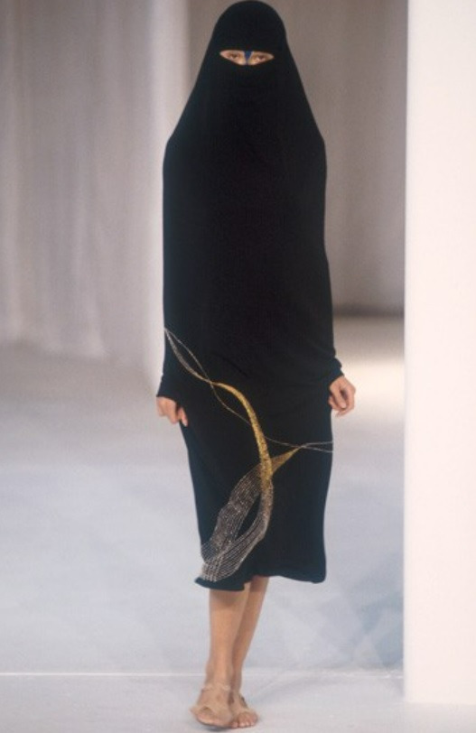후세인 샬라얀은 런던의 세인트 마틴 출신으로 1994년 세빌로의 테일러샵 'Timothy Everest'와 파트너십을 맺어 자신의 이름으로 브랜드를 만듭니다. 98년 패션쇼는 터키 이슬람 사회에서 여성의 얼굴을 가리는 이슬람 문화를 모티브 했죠. 얼굴 전체를 가리는 일련의 무거운 나무 헬멧으로 가리거나 머리부터 발끝까지 검은 천으로 모델을 덮기도 했습니다. 이슬람 문화를 모티브를 했지만 패션 씬에서 얼굴을 가린다는 건 마틴 마르지엘라의 영향이 어느 정돈 있었던 것 같습니다.