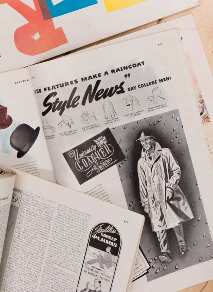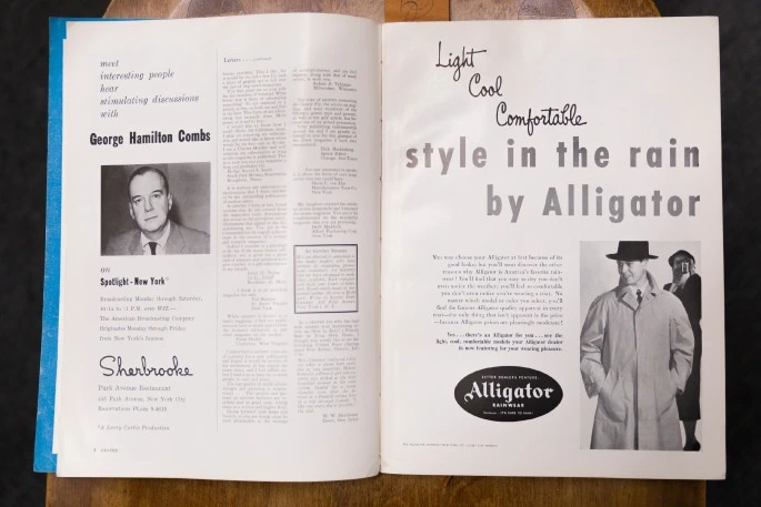 Alligator의 발마칸 코트는 1950년대 미국에서 주문제작이지만 대량 생산으로 저렴한 가격에 제공을 하여 인기를 얻은 제품입니다. 기능성 소재를 잇달아 출시하며 ‘우수한 방수성’, ‘고품질 개버딘’, ‘독점 원단’을 특징으로 하는 신개발 제품에 영국 유명 원단과 경쟁을 했죠. 1970년대 Men’s Club 매거진의 백호를 보면 거의 모든 호에서 Alligator의 발마칸 코트가 나오는 기사를 찾을 수 있습니다.
