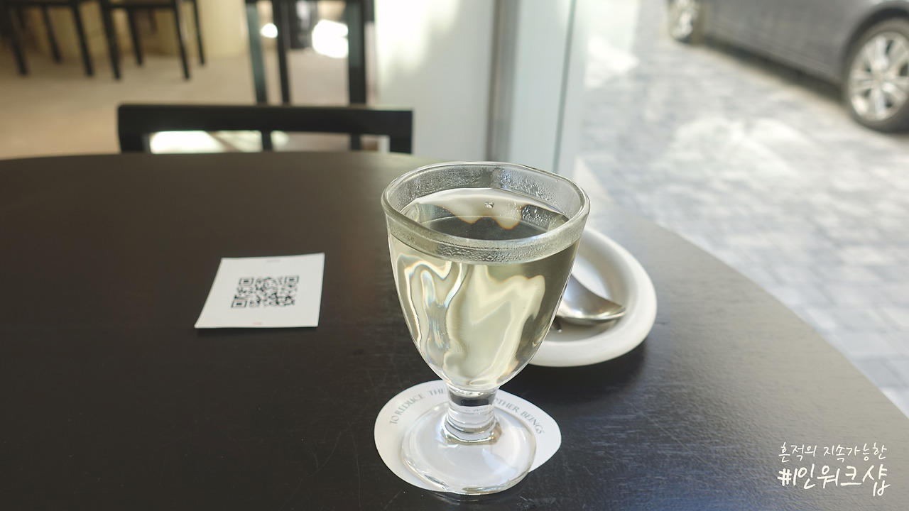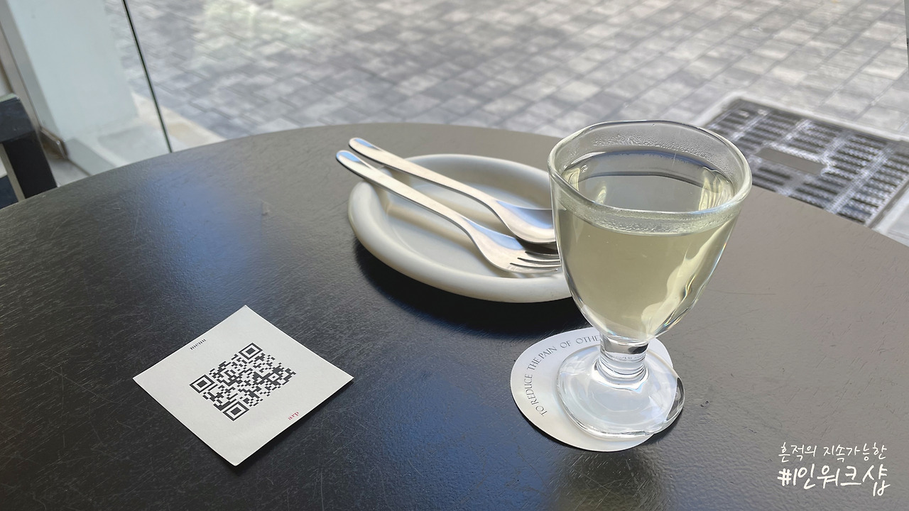 어디에 앉을까 두리번거리다 창가의 작은 테이블 앞에 자리를 잡았다. 모든 게 깔끔 그 자체네. 식기류도, QR코드로 보는 메뉴판도.