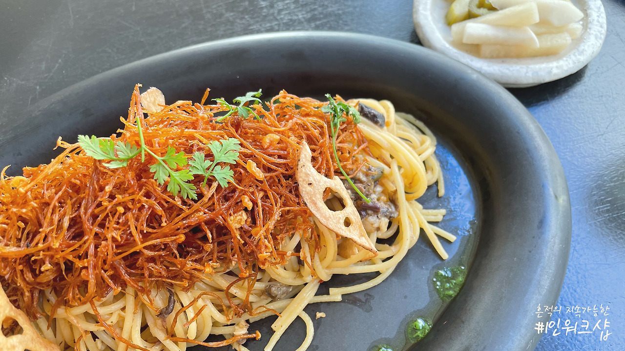 한 입 먹는 순간 머릿속에 떠오른 생각이 있다. ‘아니 이 맛있는 걸 여태 부산 사람들만 먹은 거야?!’. 이걸 비건 지향 2년 차가 넘어서야 맛 보다니. 맛도 보는 그대로였다. 고소하고 담백한데 느끼하지 않았다. 버섯은 바삭하고 고사리는 촉촉했다. 얇은 면은 씹기에 좋았고 적당히 잘 익었다. 혼자라서 아쉬운 건 다른 메뉴를 맛보지 못했다는 점뿐이었다.