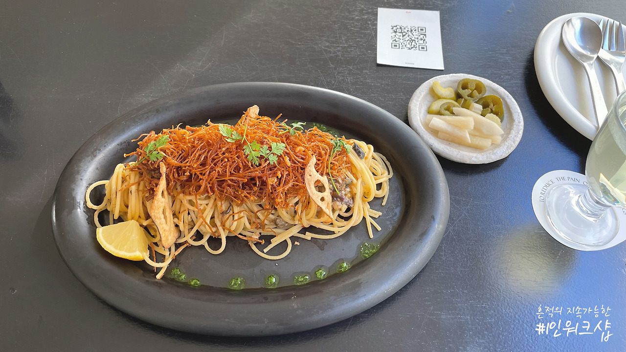 이 글을 읽어내리며 나의 찬양이 조금 과하다고 느껴진다면, 그건 당신이 이곳의 시그니처 메뉴인 고사리 파스타를 맛보지 못했기 때문이다. 고사리 페스토와 고사리, 팽이버섯과 연근칩, 처빌이라는 허브에 레몬. 정말 군더더기가 없는데 충분한 한 그릇 음식의 재료들이었다. 딱 이 정도의 비주얼도 마음에 들었다. 흘러내릴 듯 화려한 비주얼도, 어딘가 돈이 아까워지는 심플함도 아닌 적당한 먹음직스러움.